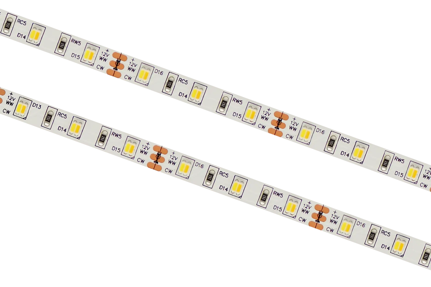 Profesjonalna taśma LED do pracy ciągłej, o skuteczności świetlnej 100lm/W. Diody z możliwością zmiany temperatury barwowej w zakresie 2700-6000K. Dwuwarstwowy podkład PCB o grubości ścieżek miedzianych 3oz charakteryzuje się małymi spadkami napięcia oraz niższą temperaturą pracy. Na podłożu taśma klejąca 3M 300 LSE. Diody spełniające wymagania testu LM-80 gwarantującego niski spadek strumienia świetlnego oraz niezmienność barwy w czasie.