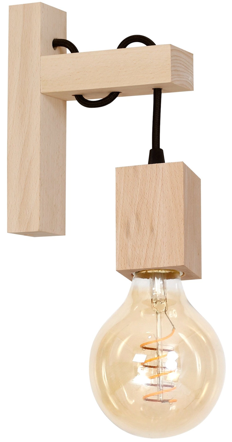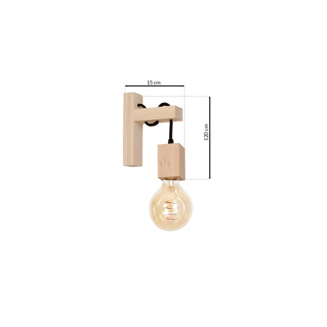 Kinkiet JACK 581 posiada jedno źródło światła w formie żarówki o okrągłej bańce. Gwint żarówki LED oznaczono symbolem E27. Żarówka została zamocowana w drewnianej oprawce, którą połączono z drewnianym kinkietem za pomocą krótkiego przewodu. Wysokość lampy wynosi 22 cm, a jej szerokość to 7 cm. Punkt świetlny znajduje się w odległości 15 cm od ściany. Maksymalna moc żarówki LED to 40 W. Wartość zasilania wynosi 230 V. Do tej obudowy można przymocować źródło światła w klasie od A++ do E.