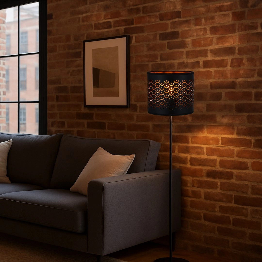 Elegancka lampa podłogowa MORGAN to połączenie klasycznej formy z nowoczesnym wykończeniem – czarna konstrukcja z detalami w kolorze złota przyciąga uwagę i nadaje wnętrzu szlachetnego charakteru. Dzięki wysokiej podstawie oraz szerokiemu abażurowi, świetnie sprawdzi się jako doświetlenie salonu lub kącika czytelniczego. Pasuje do standardowych żarówek z dużym gwintem i nie wymaga skomplikowanego montażu – wystarczy podłączyć do gniazdka i cieszyć się światłem.