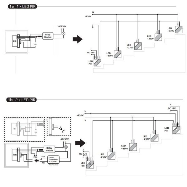 Schemat podłączenia w układ jednego oczka z czujnikiem ruchu: