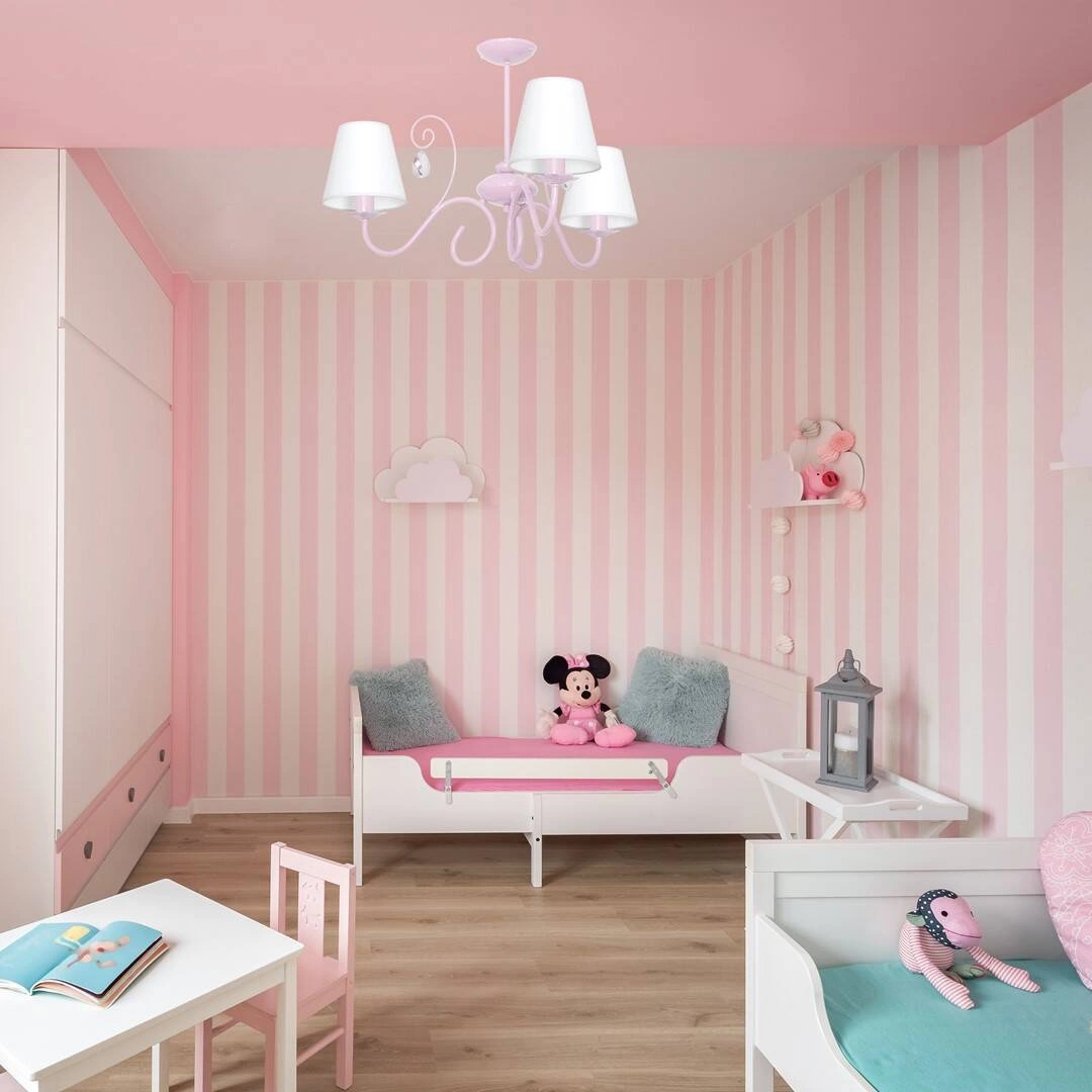 SARA PINK MLP1051 to nowoczesny żyrandol z trzema źródłami światła, który idealnie wkomponuje się do dziecięcego pokoju. Wykonany został z wysokiej jakości metalu w kolorze różowym, abażury są z tkaniny w kolorze białym. Elementem wyróżniającym lampy są finezyjnie powyginane ramiona ozdobione kryształkami. Wysokość lampy to: 40 cm, szerokość 70 cm, głębokość 70 cm. Klosze mają wysokość 15 cm. Źródłem światła jest żarówka typu E14 o mocy max 40W w ilości 3 szt.