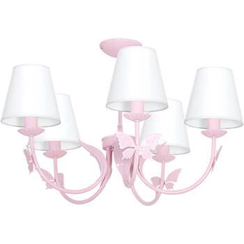 ALICE PINK MLP964 to nowoczesny żyrandol z pięcioma źródłami światła, który idealnie wkomponuje się do dziecięcego pokoju. Wykonany został z wysokiej jakości metalu w kolorze pudrowego różu, abażury są w kolorze białym. Elementem wyróżniającym lampy są zdobienia w kształcie motyli. Wysokość lampy to: 40 cm, szerokość 62 cm, głębokość 62 cm. Klosz ma wysokość 15 cm. Źródłem światła jest żarówka typu E14 o mocy max 40W w ilości 5 szt.