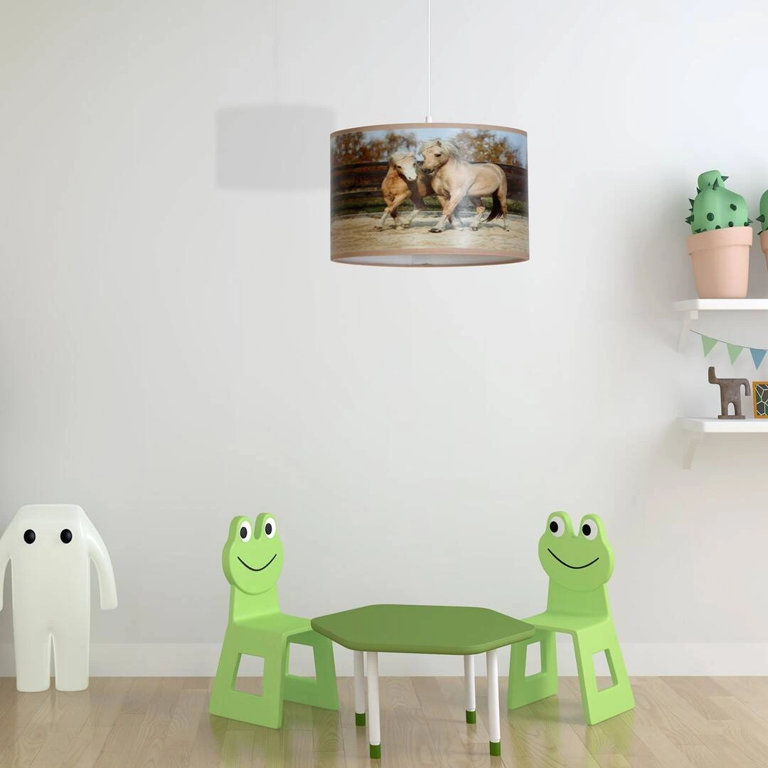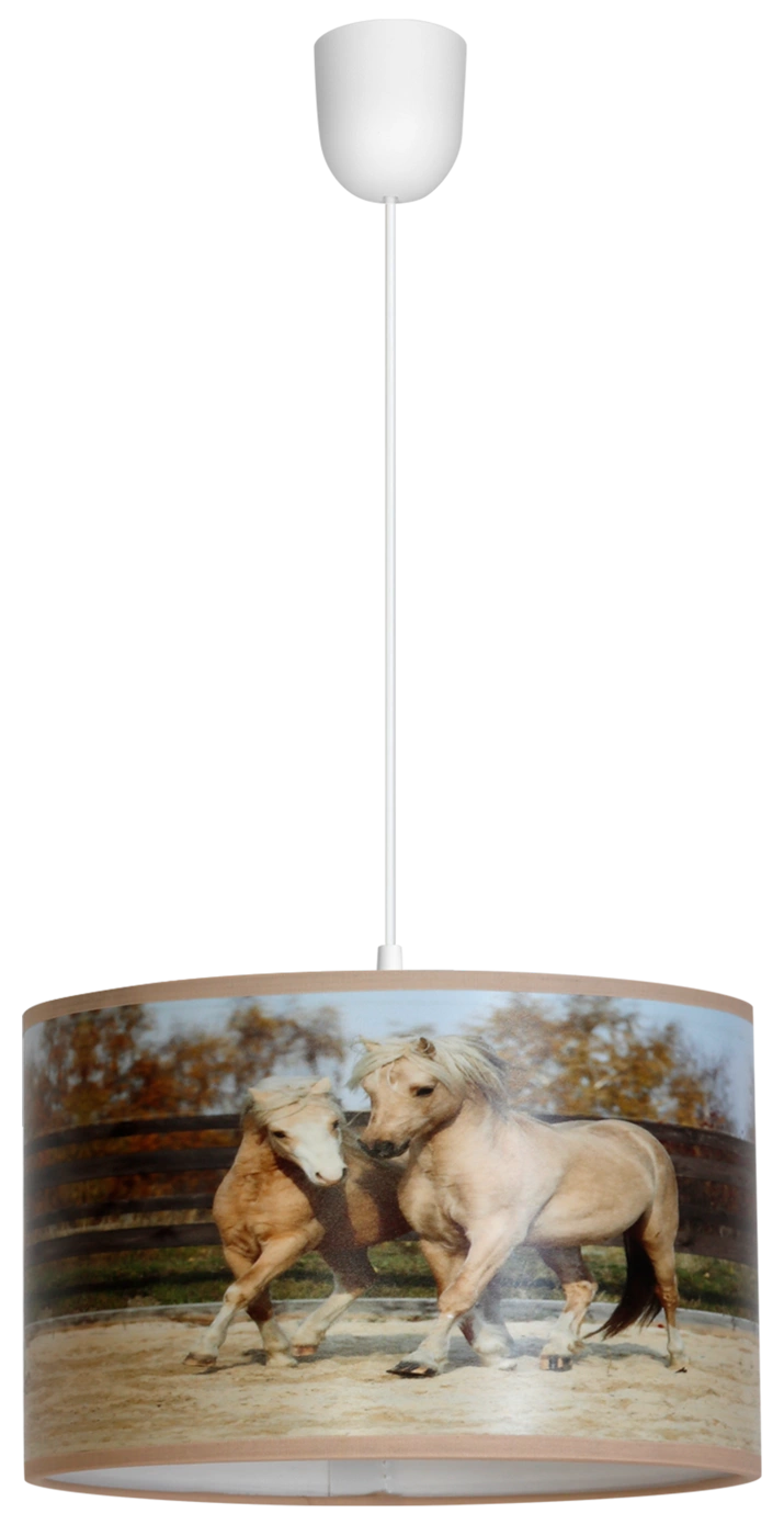 HORSES MLP846 to nowoczesna lampa wisząca z jednym źródłem światła, która idealnie wkomponuje się do dziecięcego pokoju. Wykonana została z wysokiej jakości metalu i PVC. Elementem wyróżniającym lampy jest wielokolorowy abażur z motywem koni. Dużą zaletą jest możliwość regulacji wysokości. Wysokość maksymalna lampy to: 90 cm, szerokość 30 cm, głębokość 30 cm. Źródłem światła jest żarówka typu E27 o mocy max 60W w ilości 1 szt.