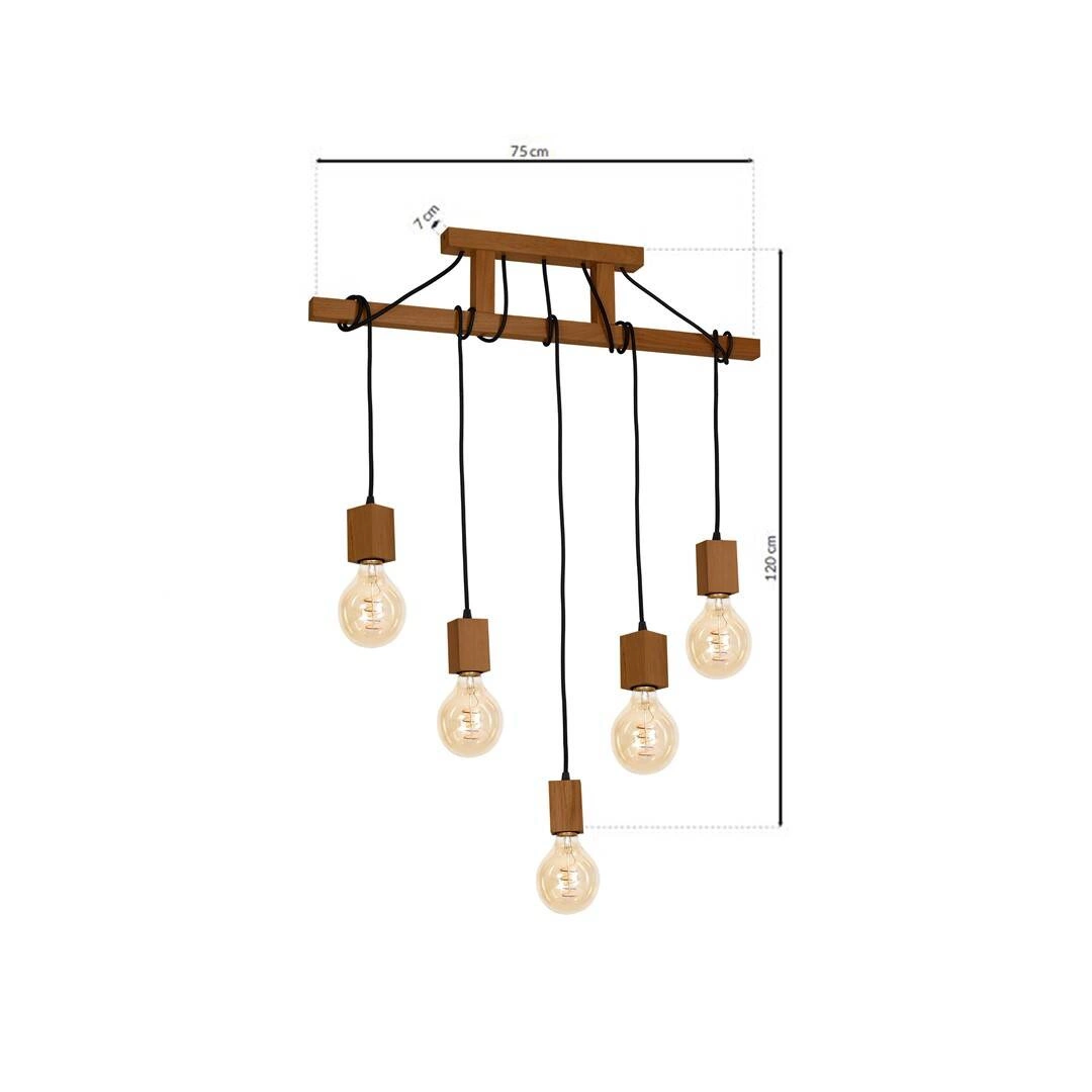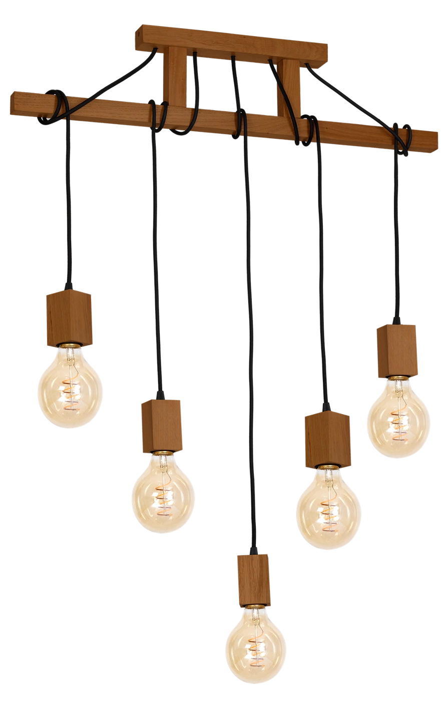 JACK MLP4358 to nowoczesna lampa wisząca z pięcioma źródłami światła. Wykonana została z wysokiej jakości drewna w kolorze dębu. Lampa nie posiada kloszy co sprawia że odsłonięte żarówki są elementami ozdobnymi dlatego warto wybrać ich dekoracyjny model. Oprawa będzie idealnym wyborem do wnętrz urządzonych w stylu nowoczesnym oraz skandynawskim. Doskonale wkomponuje się do: salonu, sypialni, jadalni, gabinetu, biura, lokalu, kuchni. Dużym atutem jest możliwość regulacji wysokości. Wysokość maksymalna lampy to: 120 cm, szerokość 75 cm, głębokość 7 cm. Źródłem światła jest żarówka typu E27 o mocy max 60W w ilości 5 szt.