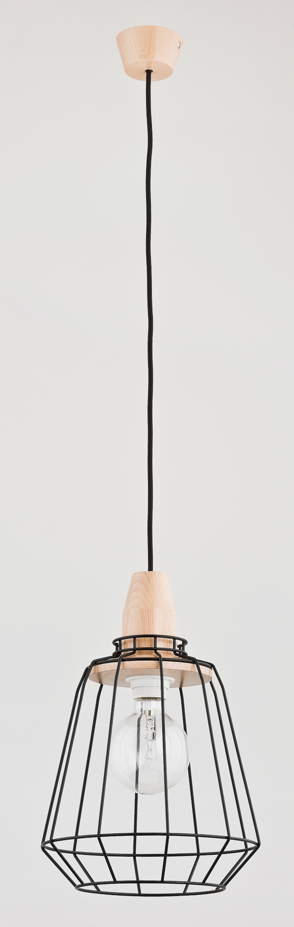 Druciana lampa wisząca PEKA w kolorze czarnym z elementami drewna o średnicy 24cm w nowoczesnym stylu.