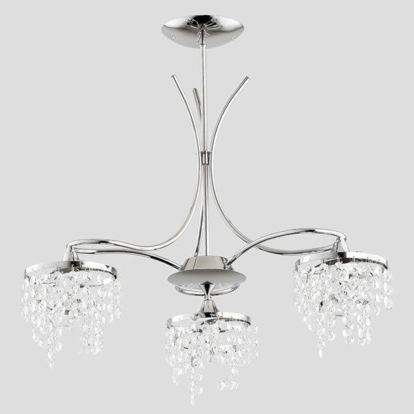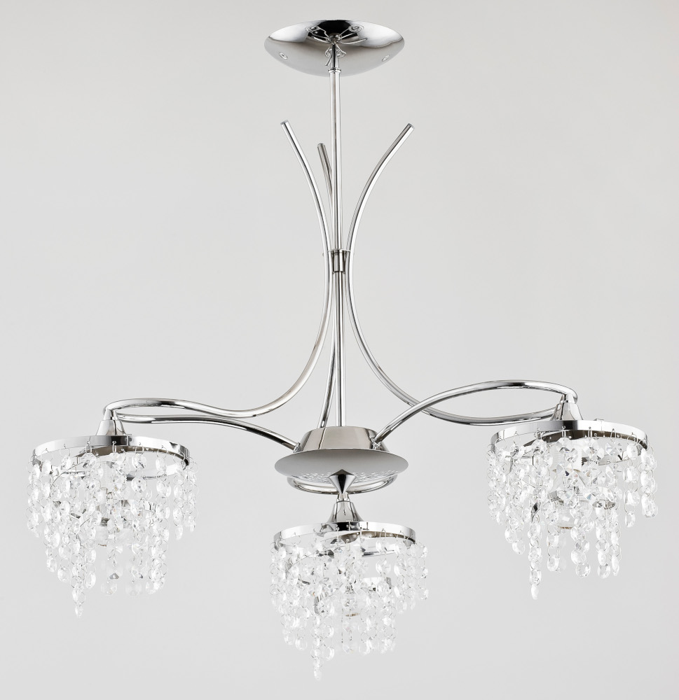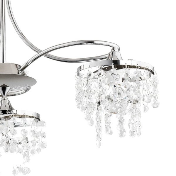 Stelaż lampy wykonany z metalu w kolorze chromu, na którym zwisają transparentne kryształki.