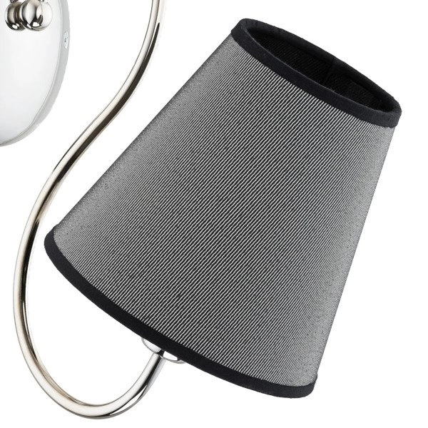 Stelaż lampy wykonany z metalu w kolorze chromu z szarym abażurem.