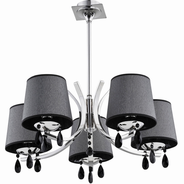 Całość wypełniają szare abażury oraz szklane kryształki w kolorze czarnym.