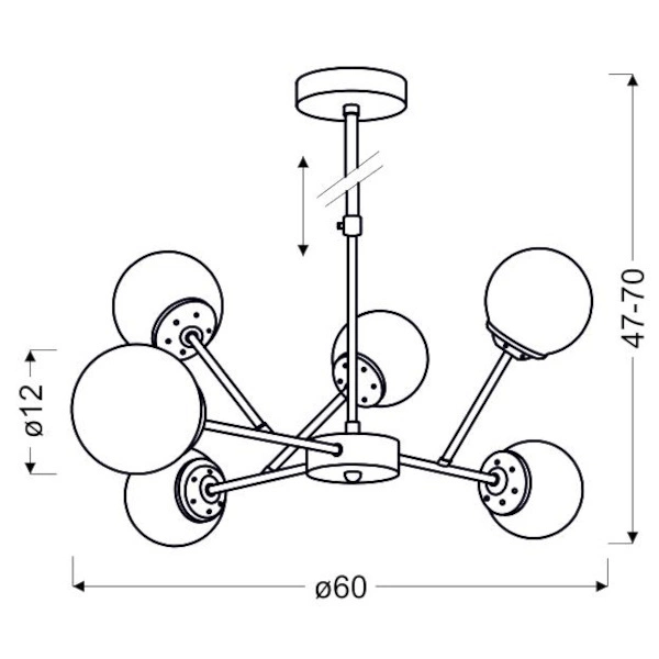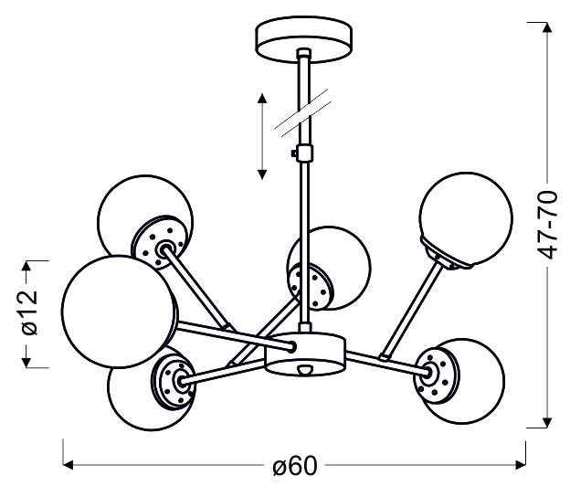 BEST 36-67272 to nowoczesna lampa wisząca z sześcioma źródłami światła. Korpus lampy wykonano z chromowanego metalu. Kuliste klosze są z transparentnego szkła. Dodatkowym elementem ozdobnym lampy są miedziane tuleje na oprawkach żarówek. Oprawa będzie idealnym wyborem do nowoczesnych wnętrz. Doskonale będzie się prezentować w: salonie, jadalni, sypialni, pokoju młodzieżowym, gabinecie, biurze, lokalu. Lampa posiada możliwość regulacji wysokości na teleskopowej sztycy. Wysokość maksymalna lampy to: 70 cm, szerokość 60 cm, głębokość 60 cm. Źródłem światła jest żarówka typu E14 o mocy max 40W w ilości 6 szt.