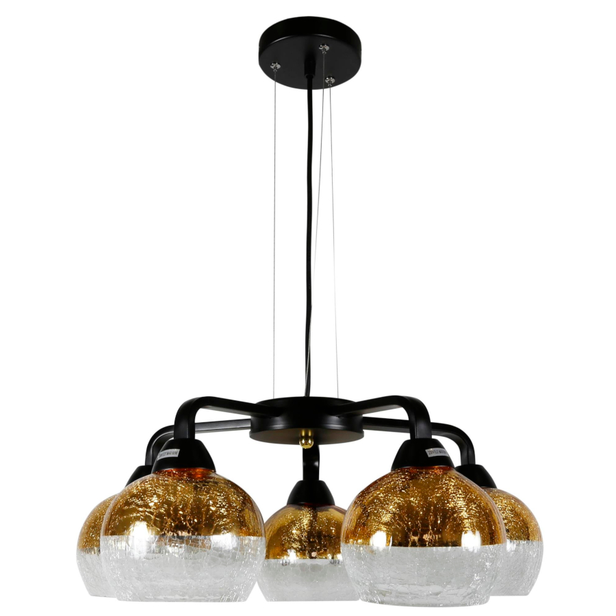 CROMINA 35-57266 to nowoczesna lampa wisząca z pięcioma źródłami światła. Podstawę lampy wykonano z wysokiej jakości stali w kolorze czarnym. Lampa posiada pięć dwukolorowych kloszy: lustrzany złoty na górze, transparentny na dole z efektem popękanej struktury szkła po całości. Oprawa będzie idealnym wyborem do wnętrz urządzonych w nowoczesnym stylu. Doskonale będzie się prezentować w: salonie, jadalni, sypialni, pokoju młodzieżowym, lokalu, kuchni. Dużą zaletą jest możliwość regulacji wysokości. Wysokość maksymalna lampy to: 115 cm, szerokość 55 cm, głębokość 55 cm. Źródłem światła jest żarówka typu E27 o mocy max 60W w ilości 5 szt.