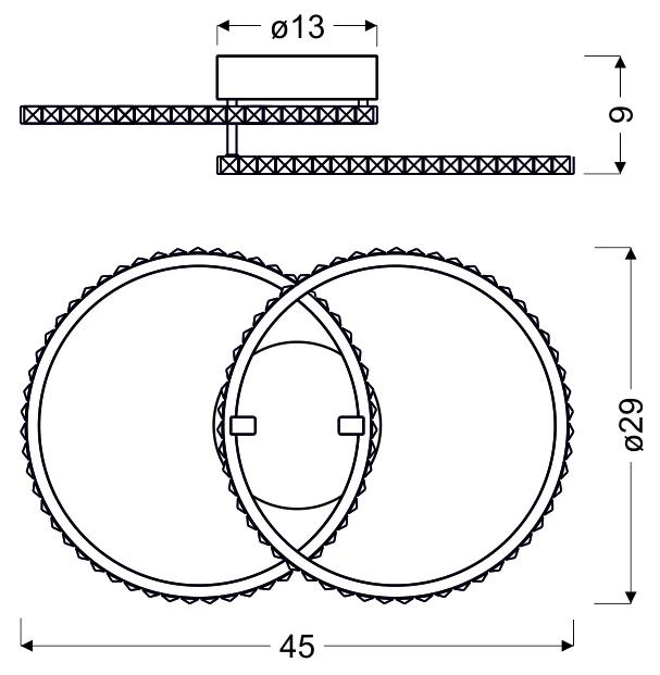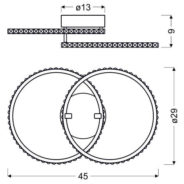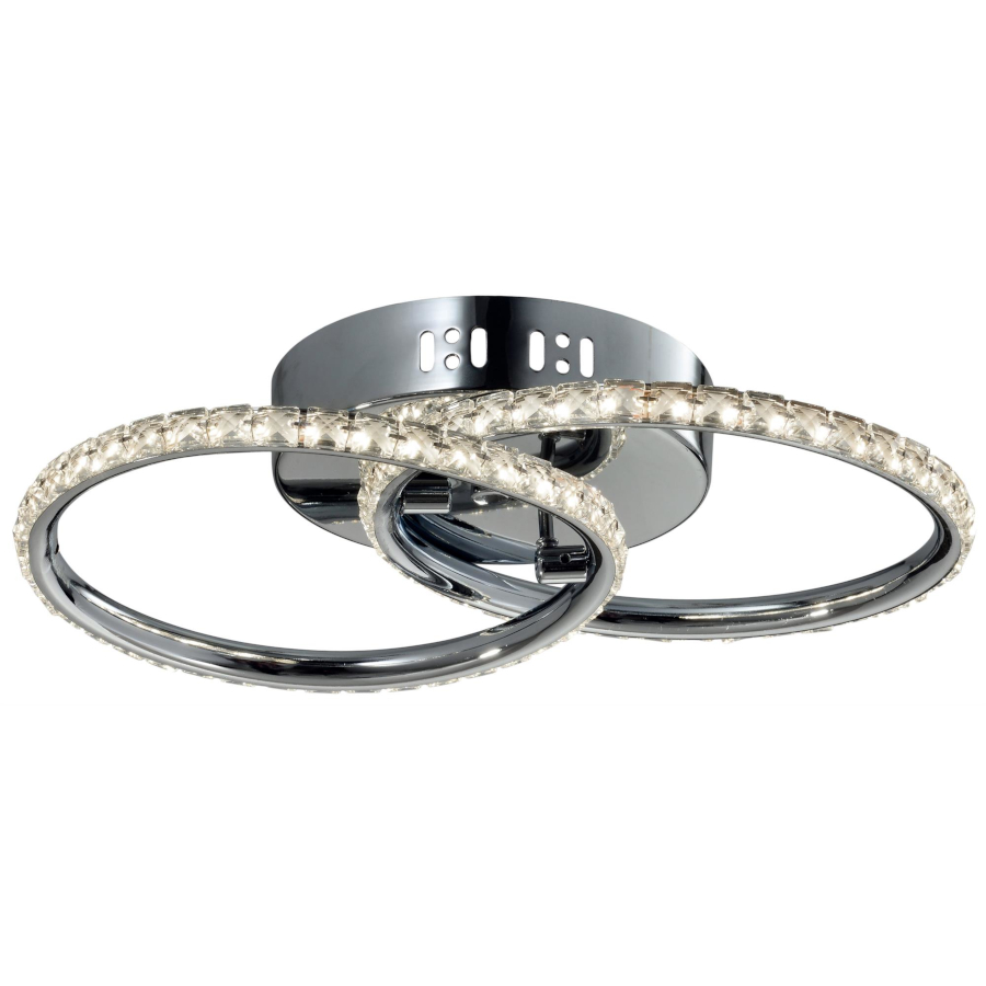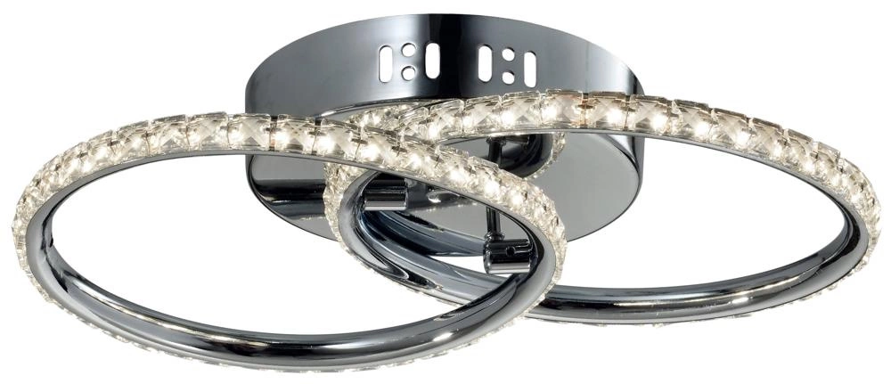 HELLO 98-69641 to designerska lampa sufitowa z dwoma źródłami światła. Korpus lampy wykonano z wysokiej jakości stali w kolorze chromowym. Źródła światła umieszone są pod transparentnymi szklanymi kryształkami, które efektownie rozpraszają światło. Oprawa będzie idealnym wyborem do wnętrz urządzonych w nowoczesnym stylu. Doskonale będzie się prezentować w: salonie, sypialni, jadalni, pokoju młodzieżowym, gabinecie, biurze, lokalu, kuchni, przedpokoju, korytarzu. Wysokość lampy to: 9 cm, szerokość 45 cm, głębokość 29 cm. Źródłem światła jest zintegrowany LED o mocy 28W, ciepłej barwie światła 3000K i jasności 2000lm