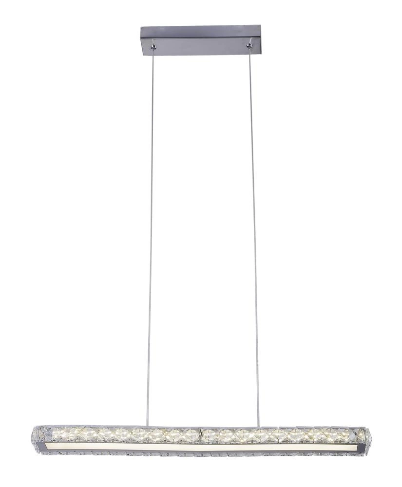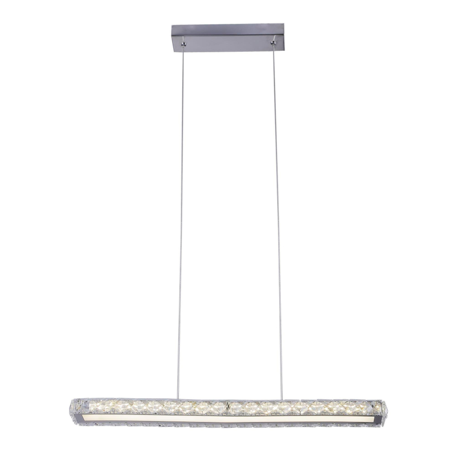 SYMPHONY 31-55743 to nowoczesna lampa wisząca z jednym źródłem światła. Wykonana została z wysokiej jakości stali w kolorze chromowym z transparentnymi, szklanymi kryształkami, które efektownie rozpraszają światło. Oprawa będzie idealnym wyborem do wnętrz urządzonych w nowoczesnym stylu. Doskonale będzie się prezentować w: salonie, sypialni, jadalni, pokoju młodzieżowym, gabinecie, biurze, lokalu, kuchni. Dużą zaletą jest możliwość regulacji wysokości oraz kąta nachylenia. Wysokość maksymalna lampy to: 100 cm, szerokość 60 cm, głębokość 7,5 cm. Źródłem światła jest zintegrowany LED o mocy 20W, neutralnej barwie 4000K i jasności 1200lm