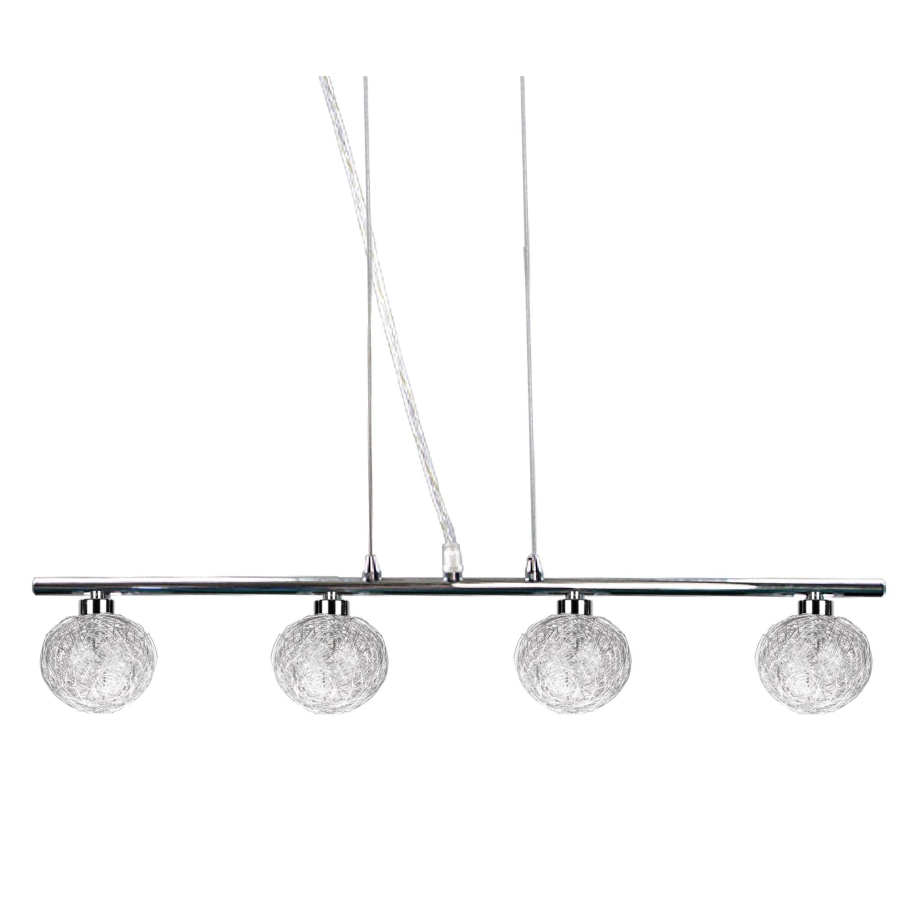 SPHERE 34-14047 to nowoczesna lampa wisząca z czterema źródłami światła. Zawiesie lampy wykonano z wysokiej jakości metalu w kolorze chromowym. Lampa posiada cztery szklane klosze oplecione cienkim drucikiem imitującym kłębuszek. Oprawa będzie idealnym wyborem do nowoczesnych wnętrz. Doskonale będzie się prezentować w: salonie, jadalni, sypialni, pokoju młodzieżowym, gabinecie, biurze, lokalu, kuchni. Dużą zaletą jest możliwość regulacji wysokości. Wysokość maksymalna lampy to: 95 cm, szerokość 61 cm, głębokość 11 cm. Źródłem światła jest żarówka typu G9 o mocy max 40W w ilości 4 szt.