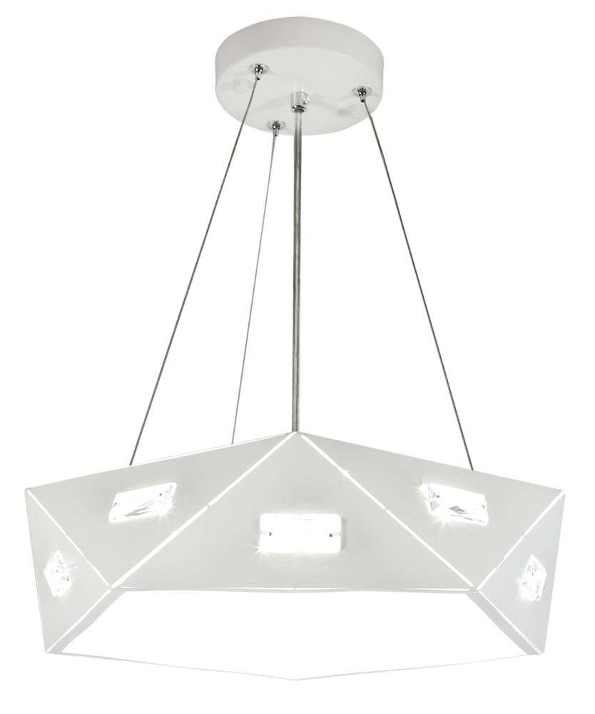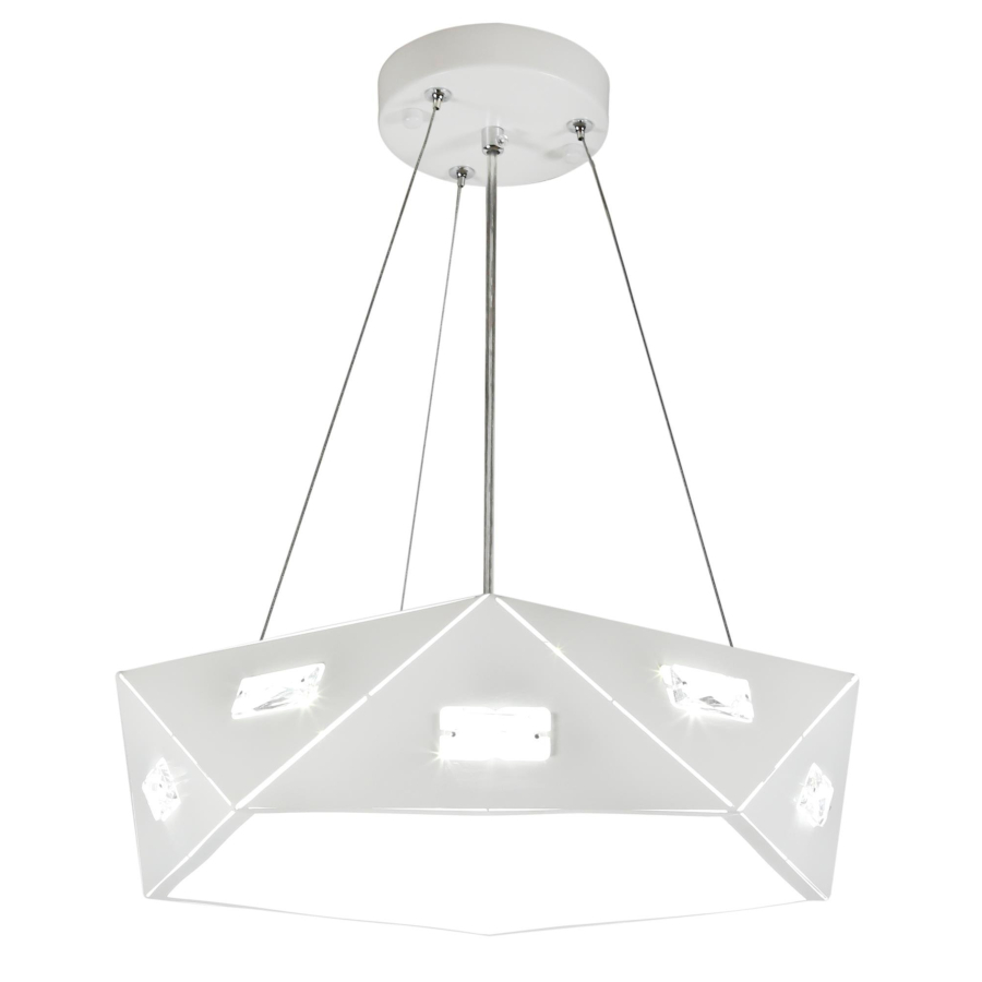 NEMEZIS 31-59147 to nowoczesna lampa wisząca z trzema źródłami światła. Lampa posiada oryginalny biały metalowy klosz zdobiony perforacją i kryształkami, które efektownie rozpraszają światło. Klosz od spodu zamknięty jest mleczną maskownicą. Całość zwisa z białej metalowej podsufitki na trzech stalowych linkach. Oprawa będzie idealnym wyborem do nowoczesnych wnętrz. Doskonale będzie się prezentować w większości pomieszczeń. Dużą zaletą lampy jest możliwość regulacji wysokości. Wysokość maksymalna to: 125 cm, szerokość 42 cm, głębokość 42 cm. Źródłem światła jest żarówka typu G9 o mocy max 40W w ilości 3 szt. (źródła światła w zestawie)