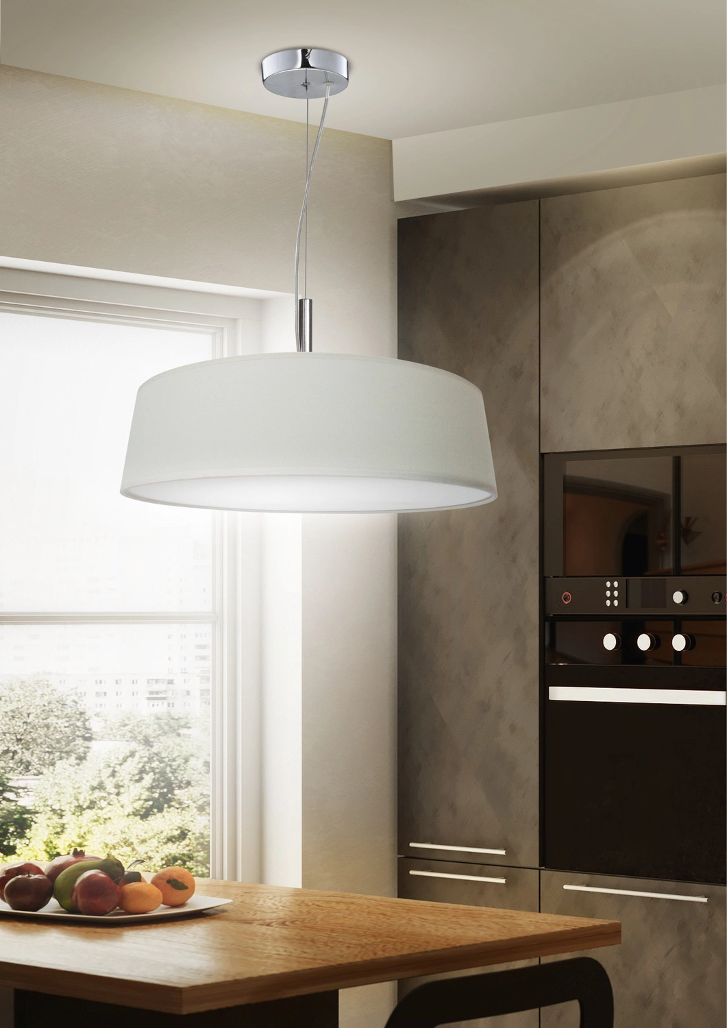 BLUM 31-46680 to nowoczesna lampa wisząca z trzema źródłami światła. Zawiesie lampy wykonano z wysokiej jakości stali w kolorze chromowym. Abażur jest z kremowej tkaniny wzmocnionej od wewnątrz PCV, zamknięty od spodu mleczną maskownicą. Oprawa będzie idealnym wyborem do wnętrz urządzonych w nowoczesnym stylu. Doskonale będzie się prezentować w: salonie, sypialni, jadalni, pokoju młodzieżowym, gabinecie, biurze, lokalu, przedpokoju. Dużą zaletą jest możliwość regulacji wysokości. Wysokość maksymalna lampy to: 110 cm, szerokość 40 cm, głębokość 40 cm. Źródłem światła jest żarówka typu E27 o mocy max 40W w ilości 3 szt.
