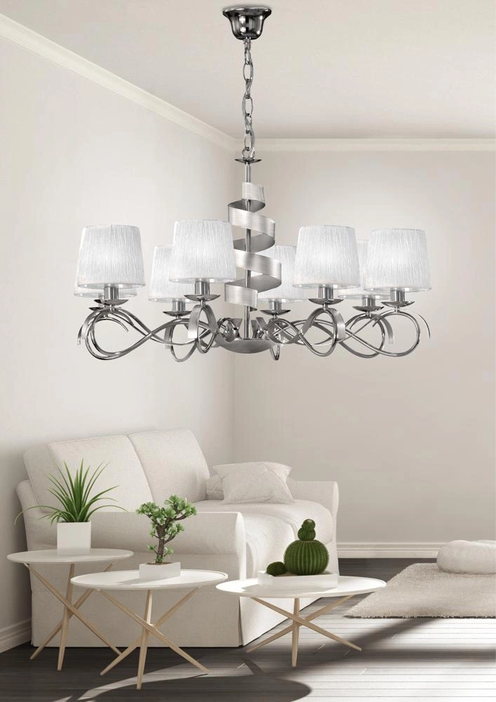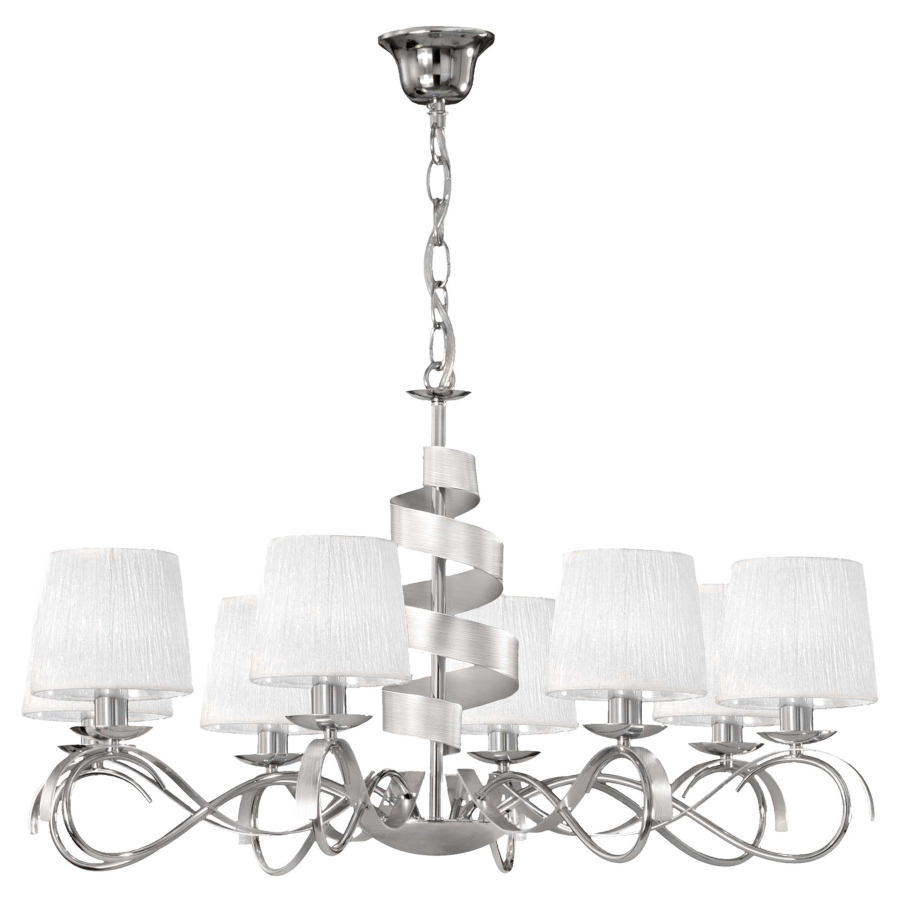 DENIS 38-23452 to nowoczesna lampa wisząca z ośmioma źródłami światła. Korpus lampy wykonano z wysokiej jakości stali w kolorze chromowym. Abażury są z białej kreszowanej tkaniny. Żyrandol będzie idealnym wyborem do wnętrz urządzonych w nowoczesnym stylu. Doskonale będzie się prezentować w: salonie, sypialni, jadalni, pokoju młodzieżowym, gabinecie, biurze, lokalu. Dużą zaletą jest możliwość regulacji wysokości. Wysokość maksymalna lampy to: 120 cm, szerokość 80 cm, głębokość 80 cm. Źródłem światła jest żarówka typu E14 o mocy max 40W w ilości 8 szt.