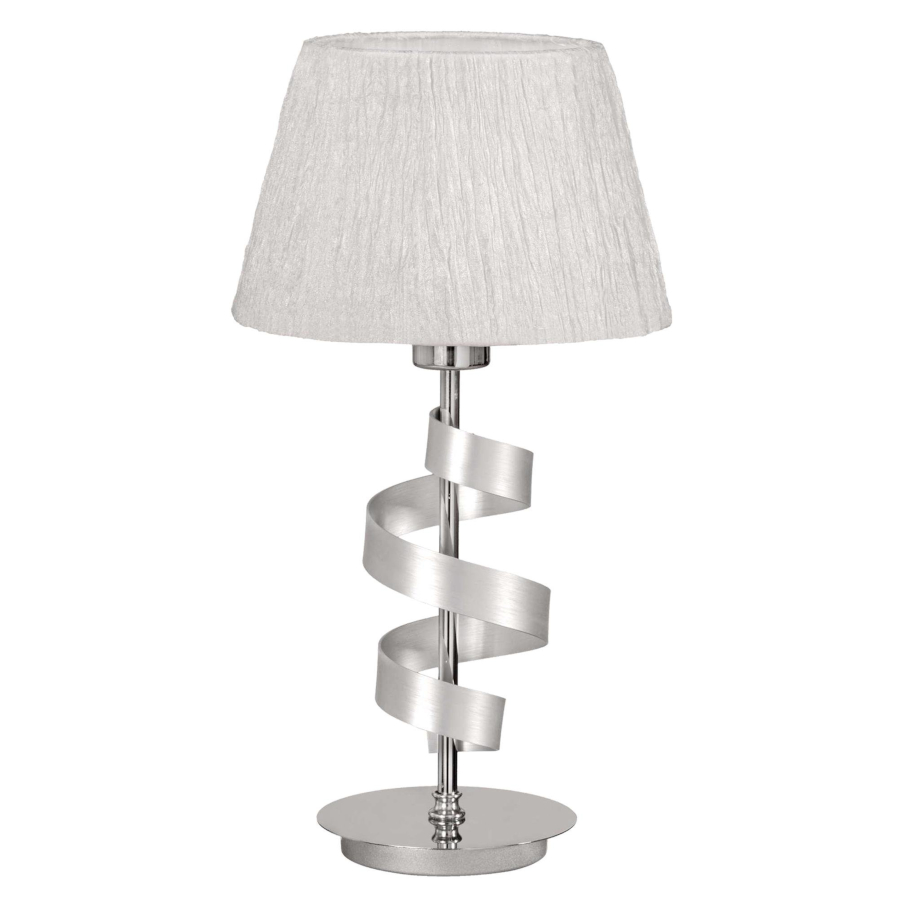 DENIS 41-23476 to nowoczesna lampa stołowa z jednym źródłem światła. Podstawę lampy wykonano z wysokiej jakości stali w kolorze chromowym ze srebrną wstążką. Abażur jest z białej kreszowanej tkaniny. Lampa będzie idealnym wyborem do wnętrz urządzonych w nowoczesnym stylu. Doskonale będzie się prezentować w: salonie, sypialni, jadalni, pokoju młodzieżowym, gabinecie, biurze, lokalu. Wysokość lampy to: 46 cm, szerokość 25 cm, głębokość 25 cm. Źródłem światła jest żarówka typu E27 o mocy max 60W w ilości 1 szt.