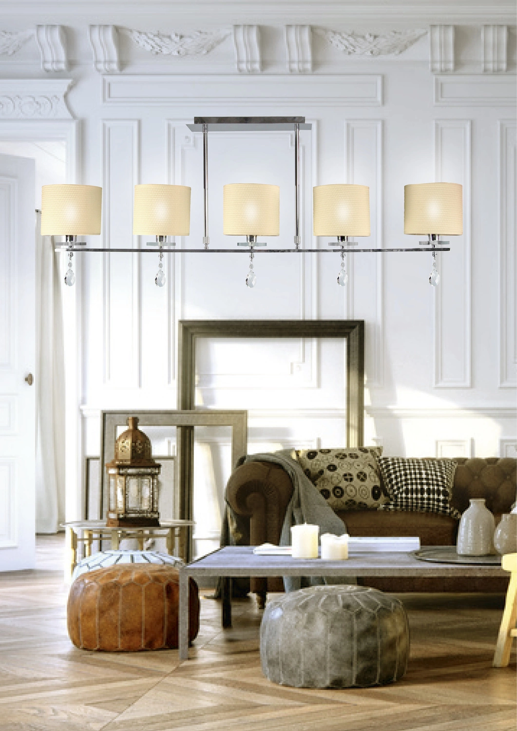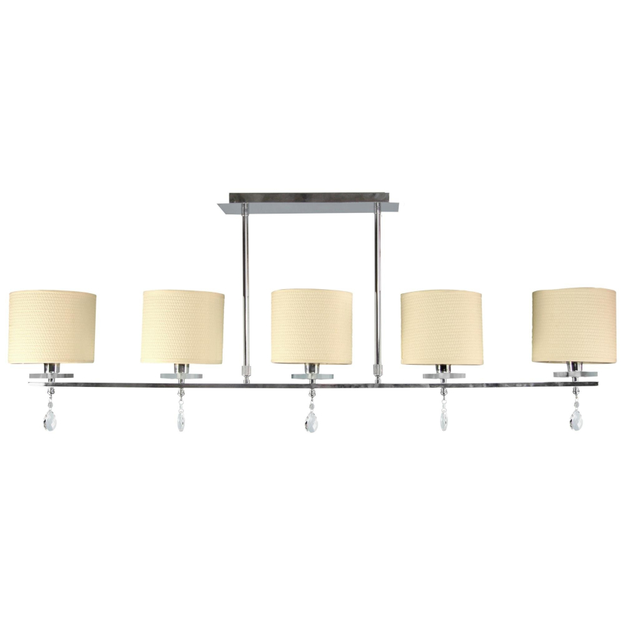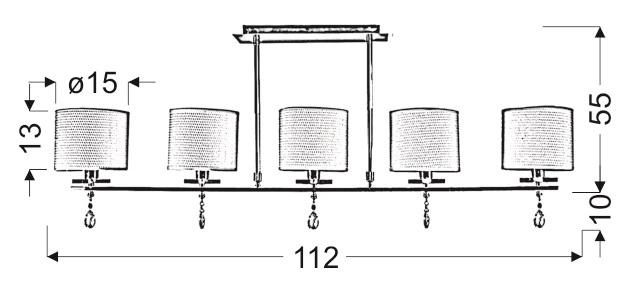 ESTERA 35-11527 to elegancka lampa sufitowa z pięcioma źródłami światła. Korpus lampy wykonano z wysokiej jakości stali w kolorze chromowym. Abażury są z jasnokremowej tkaniny wzmocnionej od wewnątrz PCV. Dodatkowo lampa ozdobiona jest zawieszonymi pod abażurami kryształkami. Żyrandol będzie idealnym wyborem do wnętrz urządzonych w klasycznym oraz nowoczesnym stylu. Doskonale będzie się prezentować w: salonie, sypialni, jadalni, pokoju młodzieżowym, gabinecie, biurze, lokalu. Wysokość lampy to: 55 cm, szerokość 112 cm, głębokość 15 cm. Źródłem światła jest żarówka typu E14 o mocy max 40W w ilości 5 szt.