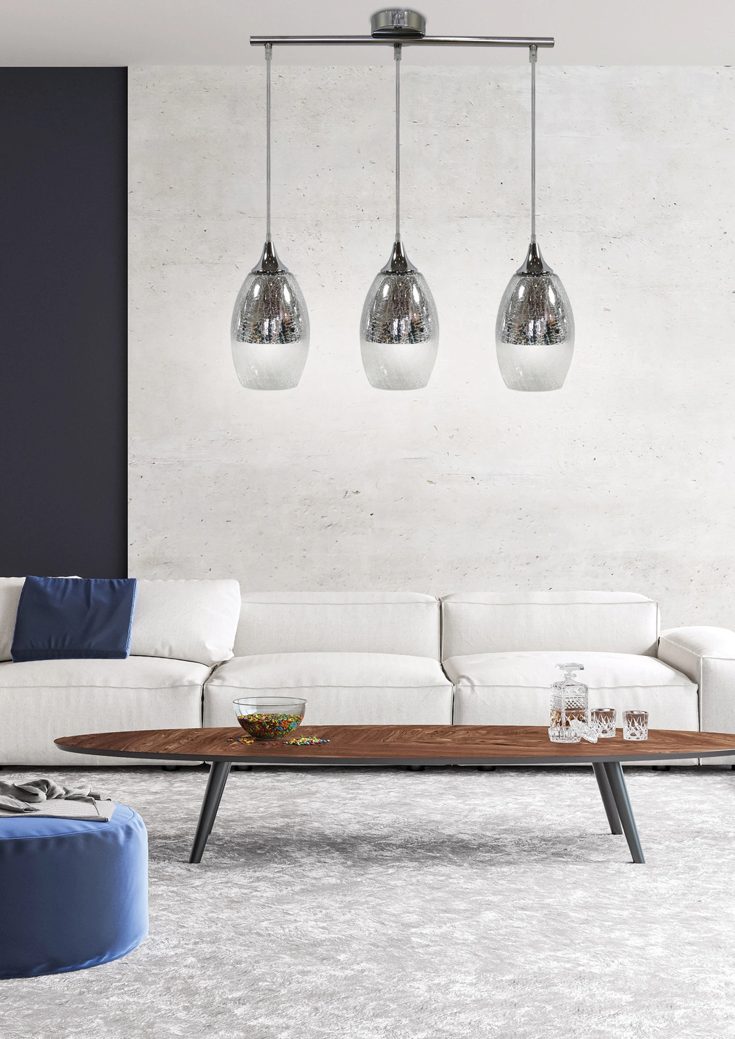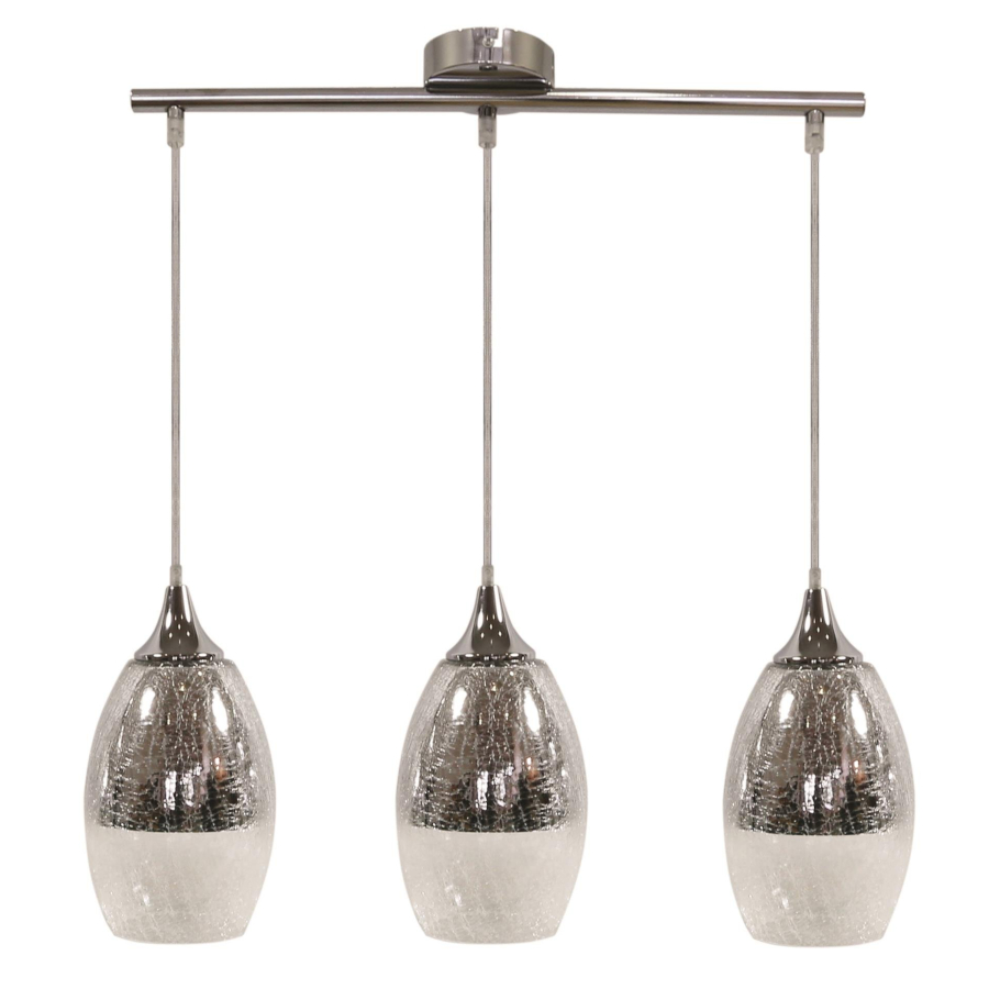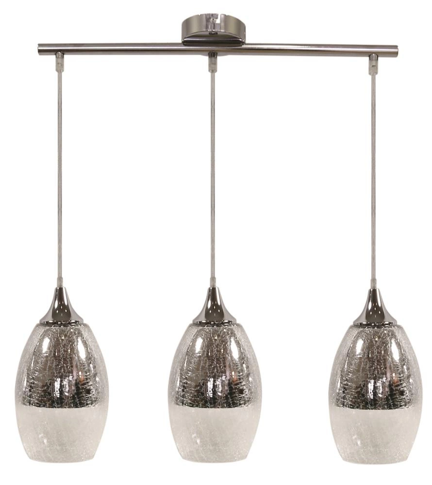 CELIA 33-51585 to nowoczesna lampa wisząca z trzema źródłami światła. Zawiesie lampy wykonano z wysokiej jakości stali w kolorze chromowym. Lampa posiada trzy klosze w kształcie łezki z efektem popękanej struktury szkła. Oprawa będzie idealnym wyborem do wnętrz urządzonych w nowoczesnym stylu. Doskonale będzie się prezentować w: salonie, jadalni, sypialni, pokoju młodzieżowym, lokalu, kuchni. Dużą zaletą jest możliwość regulacji wysokości. Wysokość maksymalna lampy to: 125 cm, szerokość 60 cm, głębokość 16 cm. Źródłem światła jest żarówka typu E27 o mocy max 60W w ilości 3 szt.