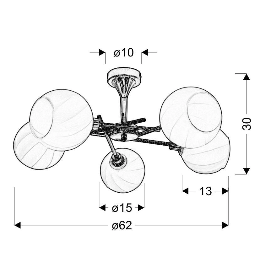 RAUL 35-72269 to nowoczesna lampa sufitowa z pięcioma źródłami światła. Wykonana została z wysokiej jakości stali w kolorze chromowym. Klosze są z białego szkła, osadzone na obrotowych ramionach, które pozwalają na zmianę ich położenia. Oprawa będzie idealnym wyborem do wnętrz urządzonych w nowoczesnym stylu. Doskonale będzie się prezentować w: salonie, sypialni, jadalni, pokoju młodzieżowym, gabinecie, biurze, lokalu, kuchni. Wysokość lampy to: 30 cm, szerokość 62 cm, głębokość 62 cm. Źródłem światła jest żarówka typu E14 o mocy max 40W w ilości 5 szt.