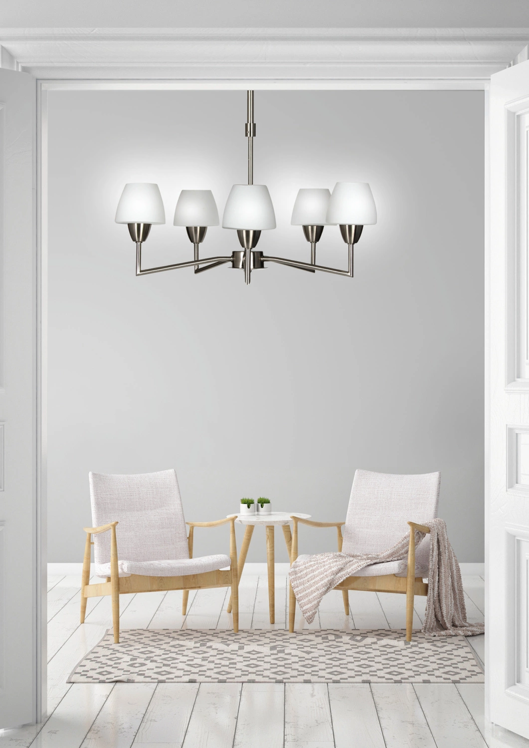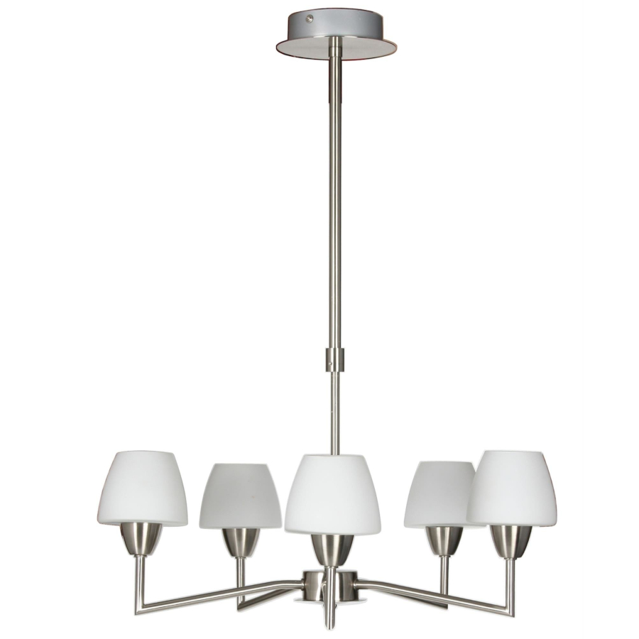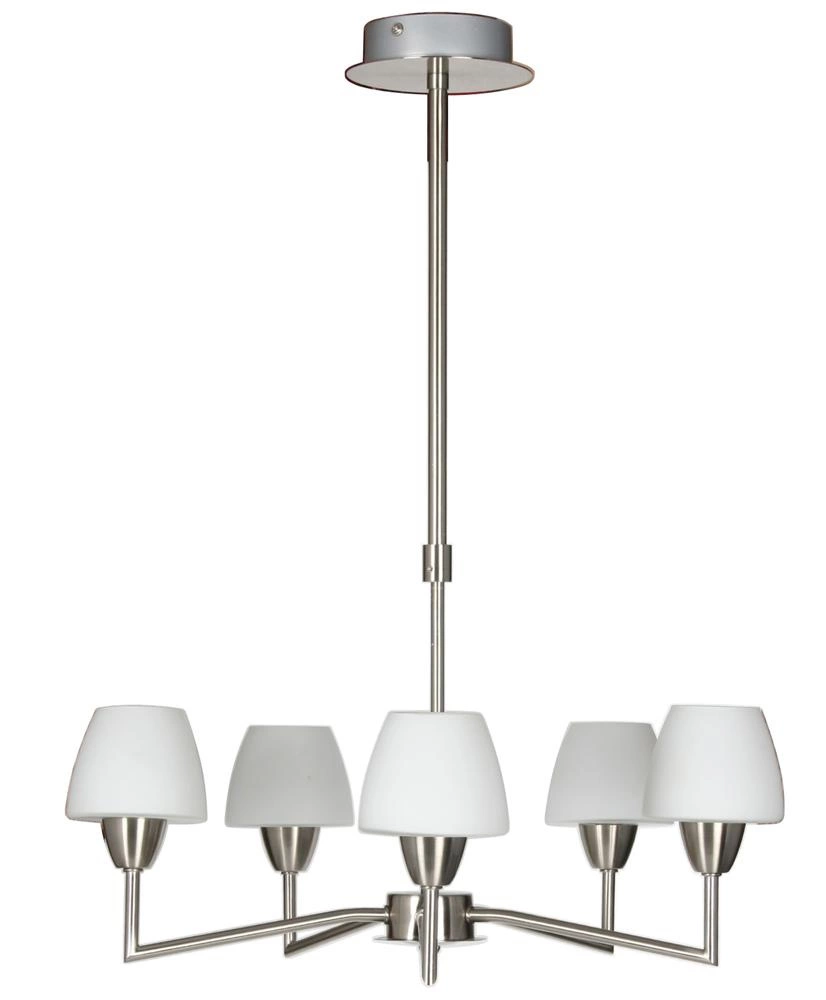 TOGO 35-10646 to nowoczesna lampa wisząca z pięcioma źródłami światła. Korpus lampy wykonano z wysokiej jakości stali w kolorze satynowym. Klosze są z białego szkła. Lampa będzie idealnym wyborem do wnętrz urządzonych w nowoczesnym stylu. Doskonale będzie się prezentować w: salonie, sypialni, jadalni, pokoju młodzieżowym, gabinecie, biurze, lokalu, kuchni. Dużym atutem jest możliwość regulacji wysokości. Wysokość maksymalna lampy to: 70 cm, szerokość 45 cm, głębokość 45 cm. Źródłem światła jest żarówka typu G9 o mocy 40W w ilości 5 szt. (źródła światła w zestawie)