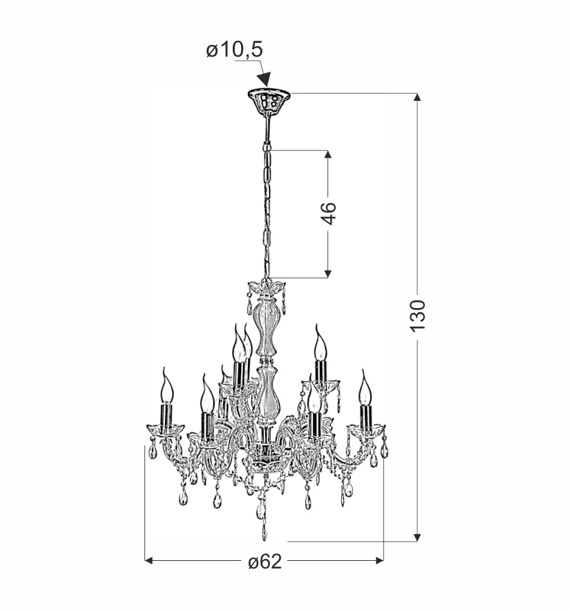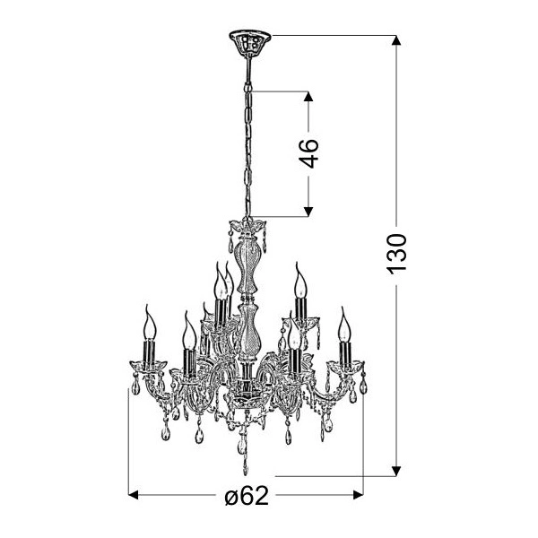 MARIA TERESA 38-94653 to bardzo elegancka, bogata w zdobienia lampa wisząca. Wykonana została z wysokiej jakości stali w kolorze złotym. Lampa posiada 8 ramion zdobionych akrylowymi osłonkami i szklanymi talerzykami, na których osadzono oprawki żarówek. Dodatkowo na każdym z ramion zawieszono transparentne kryształki. Lampa nie posiada kloszy co sprawia, że odsłonięte żarówki są elementami ozdobnymi dlatego warto wybrać ich dekoracyjny model (najkorzystniej prezentuje się z żarówkami o świecznikowym kształcie). Żyrandol będzie idealnym wyborem do wnętrz urządzonych w stylu: klasycznym, glamour oraz art-deco. Doskonale będzie się prezentować w: salonie jadalni, sypialni, salach weselnych, bankietowych, kościołach. Dużą zaletą jest możliwość regulacji wysokości. Wysokość maksymalna lampy to: 130 cm, szerokość 62 cm, głębokość 62 cm. Źródłem światła jest żarówka typu E14 o mocy max 40W w ilości 8 szt.