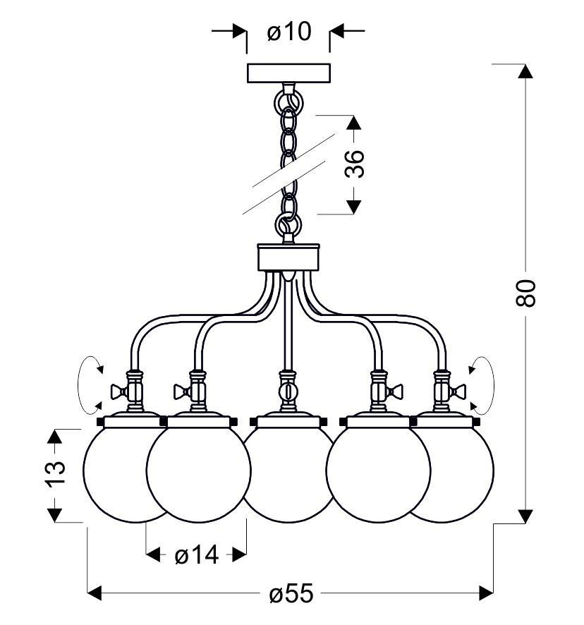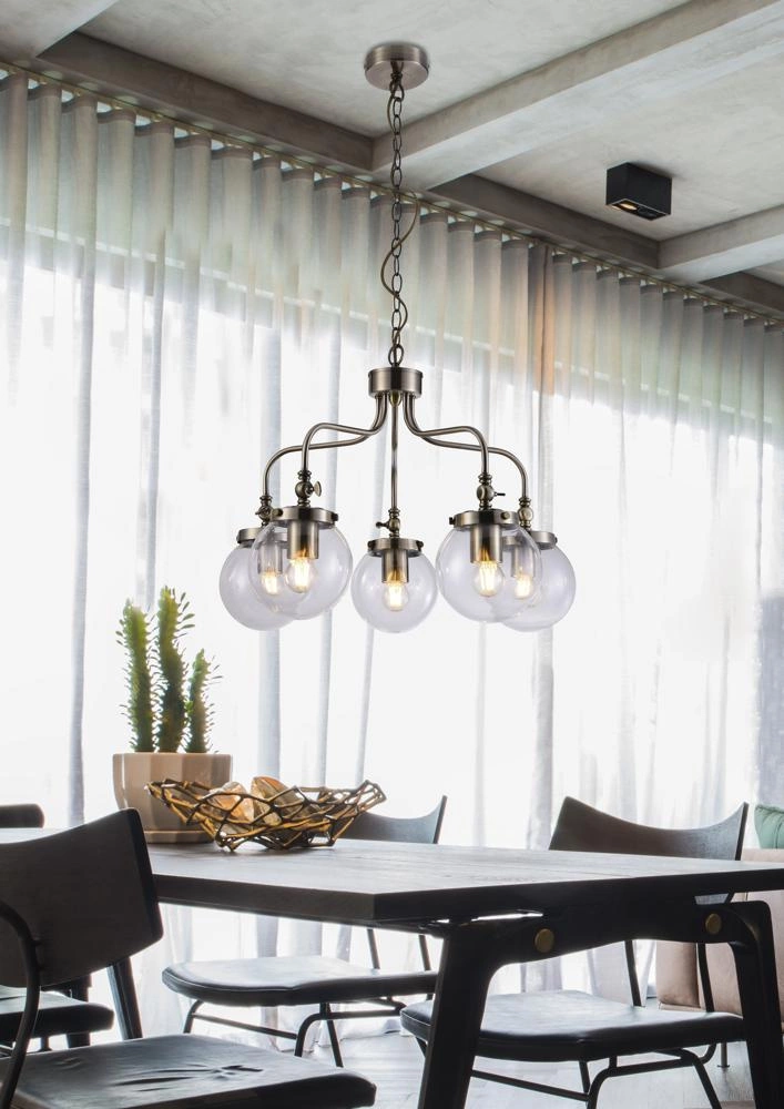BALLET 35-70876 to lampa wisząca z pięcioma źródłami światła. Korpus lampy wykonano z wysokiej jakości stali w kolorze patynowym. Klosze są z transparentnego szkła. Oprawa będzie idealnym wyborem do wnętrz urządzonych w stylu klasycznym, industrialnym oraz loftowym. Doskonale będzie się prezentować w: salonie, sypialni, jadalni, pokoju młodzieżowym, gabinecie, lokalu, przedpokoju. Dużą zaletą jest możliwość regulacji wysokości. Wysokość maksymalna lampy to: 80 cm, szerokość 55 cm, głębokość 55 cm. Źródłem światła jest żarówka typu E27 o mocy max 40W w ilości 5 szt.