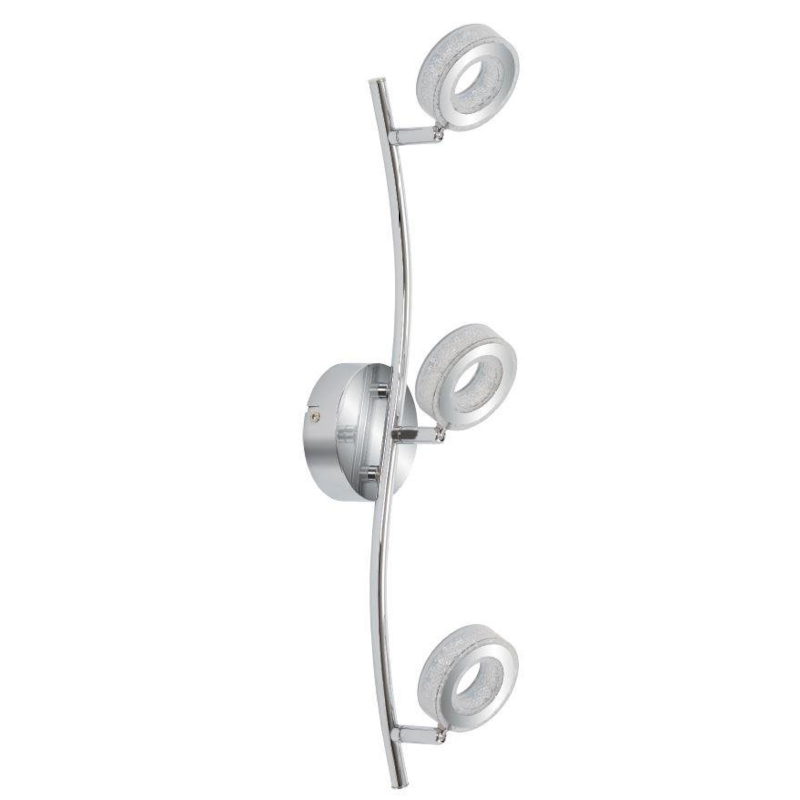 VINOLA 93-65957 to nowoczesna lampa sufitowa z trzema źródłami światła. Korpus lampy wykonano z chromowanego metalu. Lampa posiada trzy akrylowe klosze w kształcie okręgów ozdobione dekoracyjną granillą, która efektownie rozprasza światło. Klosze osadzone są na obrotowych przegubach pozwalających na zmianę ich położenia. Plafon będzie idealnym wyborem do nowoczesnych wnętrz. Doskonale będzie się prezentować w: salonie, jadalni, sypialni, pokoju młodzieżowym, gabinecie, biurze, lokalu, przedpokoju, korytarzu. Wysokość lampy to: 16 cm, szerokość 54 cm, głębokość 9 cm. Klosz ma średnicę 7,5 cm. W lampie zastosowano źródła światła LED o mocy 5W i ciepłej barwie światła 3000K w ilości 3 szt.