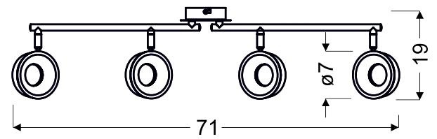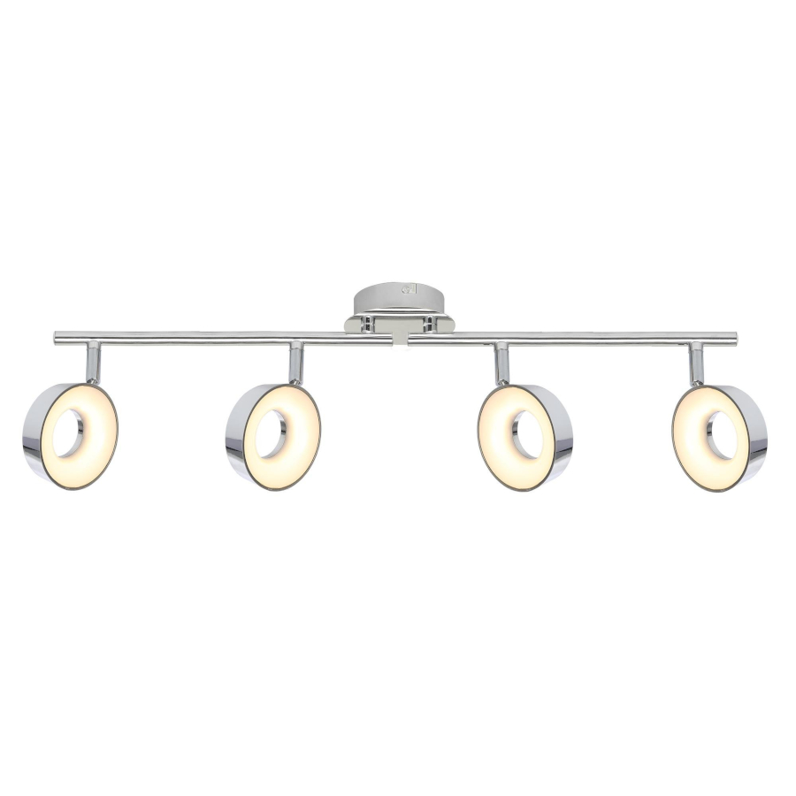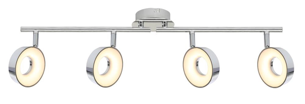 ISLA 94-61720 to nowoczesna lampa sufitowa z czterema źródłami światła. Wykonana została z chromowanej stali. Lampa posiada cztery akrylowe klosze w kształcie okręgów osadzone na obrotowych przegubach, które pozwalają na regulacje ich położenia. Plafon będzie idealnym wyborem do nowoczesnych wnętrz. Doskonale będzie się prezentować w: salonie, jadalni, sypialni, pokoju młodzieżowym, gabinecie, biurze, lokalu, przedpokoju, korytarzu. Wysokość lampy to: 19 cm, szerokość 71 cm, głębokość 10 cm. Klosz ma średnicę 7 cm. W lampie zastosowano 4 źródła światła LED o mocy 4W i ciepłej barwie 3000K.