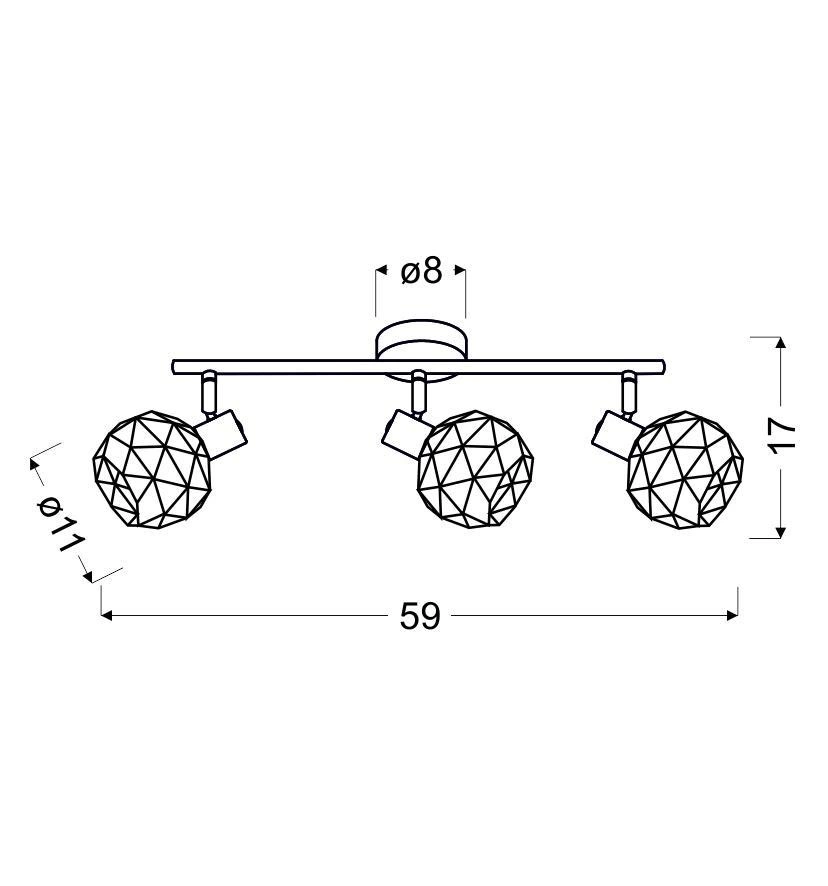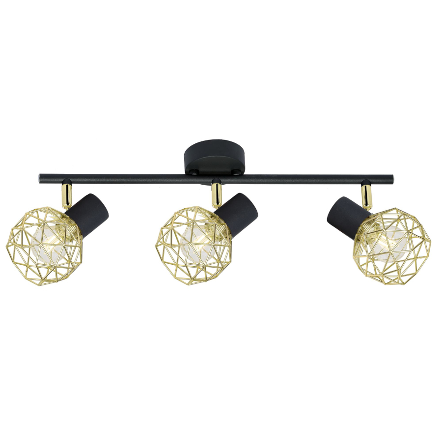ACROBAT 93-66640 to nowoczesna lampa sufitowa z trzema źródłami światła. Wykonana została z wysokiej jakości stali w kolorze czarno-złotym. Lampa posiada trzy ażurowe klosze z drutu koloru złotego osadzone na ruchomych przegubach, które dają możliwość regulacji kąta padania światła. Kształt kloszy sprawia że odsłonięte żarówki mogą być elementami ozdobnymi lampy dlatego warto wybrać ich dekoracyjny model. Oprawa będzie idealnym wyborem do nowoczesnych wnętrz. Doskonale będzie się prezentować w: salonie, jadalni, sypialni, pokoju młodzieżowym, gabinecie, biurze, lokalu, przedpokoju, korytarzu. Wysokość lampy to: 17 cm, szerokość 59 cm, głębokość 11 cm. Źródłem światła jest żarówka typu E14 o mocy max 40W w ilości 3 szt.