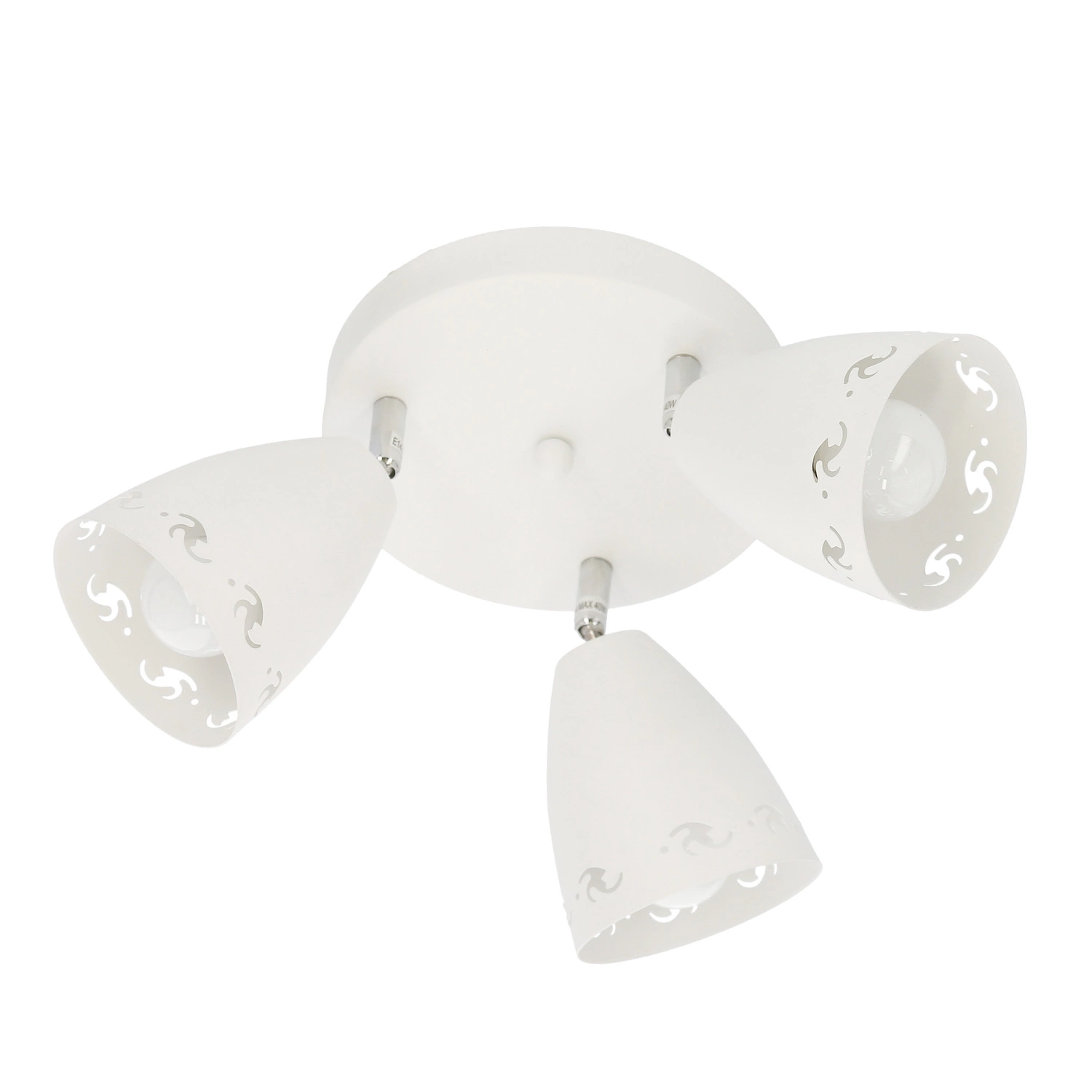 COTY 98-67135 to nowoczesna lampa sufitowa z trzema źródłami światła. Wykonana została z wysokiej jakości metalu w kolorze matowym białym. Lampa posiada trzy klosze ozdobione dekoracyjnymi wycięciami na obrzeżach. Klosze osadzone są na ruchomych przegubach, które dają możliwość regulacji w pionie i poziomie. Oprawa będzie idealnym wyborem do nowoczesnych wnętrz. Doskonale będzie się prezentować w: salonie, jadalni, sypialni, pokoju młodzieżowym, gabinecie, biurze, lokalu, przedpokoju, korytarzu. Wysokość lampy to: 16 cm, szerokość 38 cm, głębokość 38 cm. Źródłem światła jest żarówka typu E14 o mocy max 40W w ilości 3 szt.