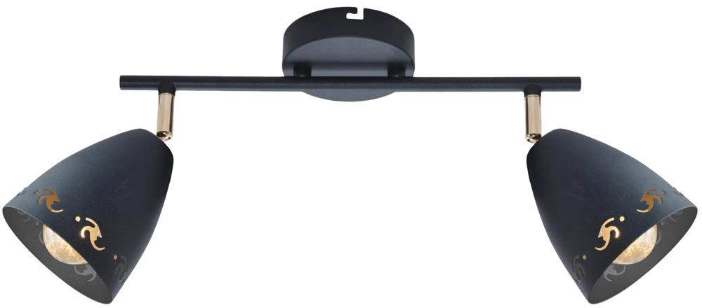 COTY 92-67166 to nowoczesna lampa sufitowa z dwoma źródłami światła. Wykonana została z wysokiej jakości metalu w kolorze czarno-złotym. Lampa posiada dwa klosze ozdobione dekoracyjnymi wycięciami na obrzeżach. Klosze osadzone są na ruchomych przegubach, które dają możliwość regulacji w pionie i poziomie. Oprawa będzie idealnym wyborem do nowoczesnych wnętrz. Doskonale będzie się prezentować w: salonie, jadalni, sypialni, pokoju młodzieżowym, gabinecie, biurze, lokalu, przedpokoju, korytarzu. Wysokość lampy to: 20 cm, szerokość 50 cm, głębokość 10 cm. Źródłem światła jest żarówka typu E14 o mocy max 40W w ilości 2 szt.