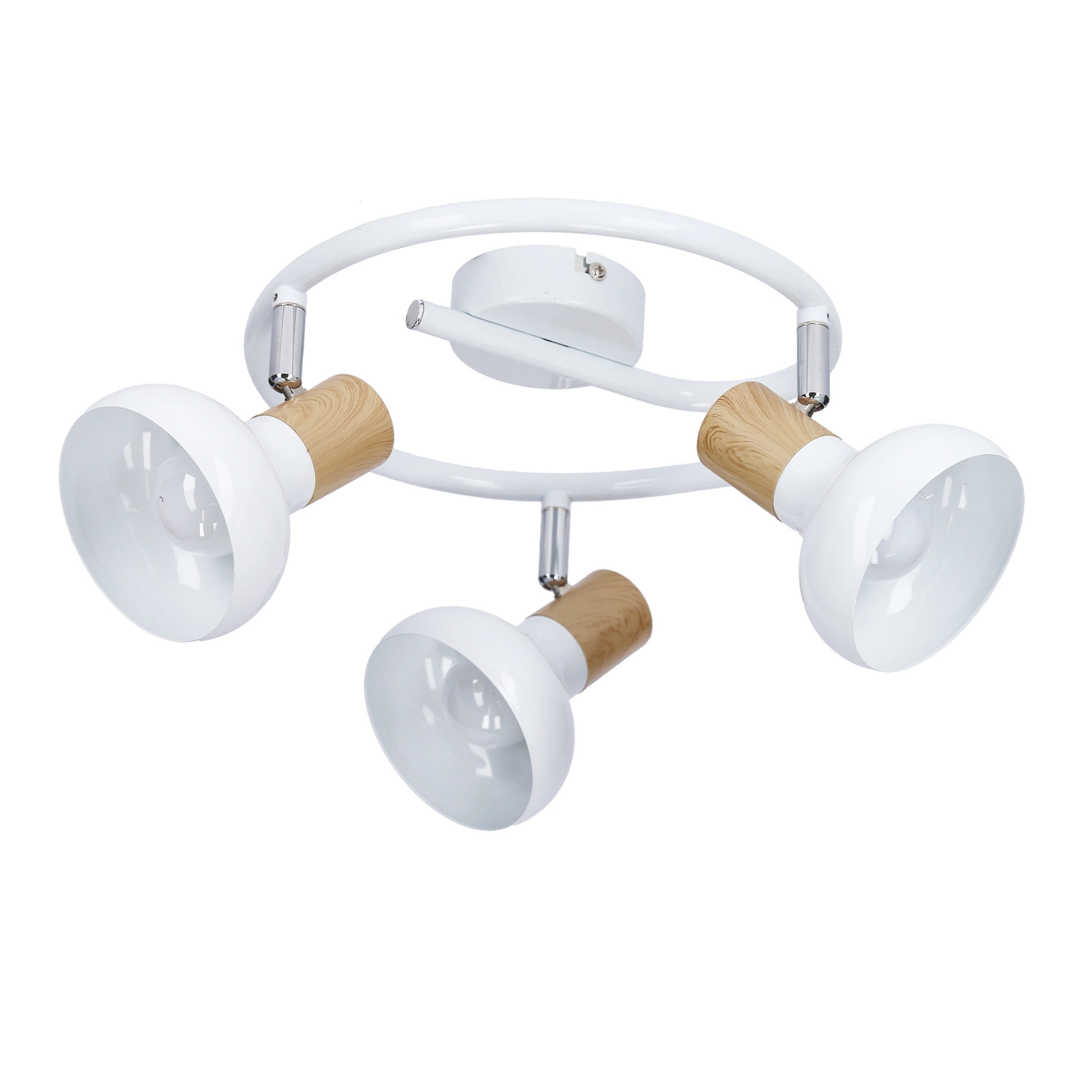 PEURTO 98-62697 to nowoczesna lampa sufitowa z trzema źródłami światła. Wykonana została z wysokiej jakości metalu w białym kolorze z dekoracyjnymi nadkloszówkami imitującymi drewno. Klosze lampy mają możliwość regulacji kąta padania światła. Oprawa będzie idealnym wyborem do nowoczesnych wnętrz. Doskonale będzie się prezentować w: salonie, jadalni, sypialni, pokoju młodzieżowym, gabinecie, biurze, lokalu, przedpokoju, korytarzu, kuchni. Wysokość lampy to: 18 cm, szerokość 40 cm, głębokość 40 cm. Źródłem światła jest żarówka typu E14 o mocy max 40W w ilości 3 szt.