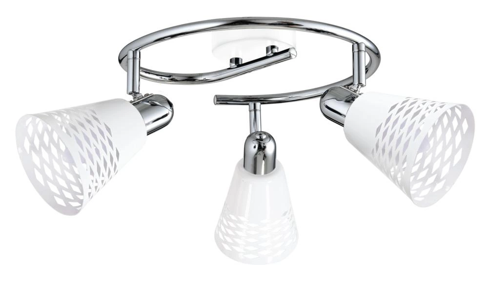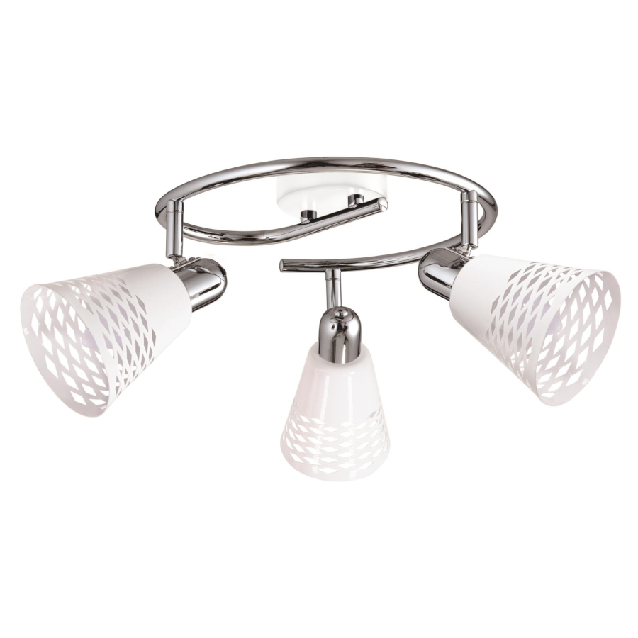 DISCOVERY 98-62185 to nowoczesna lampa sufitowa z trzema źródłami światła. Korpus lampy wykonano z chromowanego metalu. Lampa posiada trzy białe klosze o stożkowym kształcie z eleganckimi wycięciami, które po zaświeceniu zachwycają efektem rzucanego cienia. Klosze są osadzone na ruchomych przegubach, które dają możliwość regulacji kąta padania światła. Oprawa będzie idealnym wyborem do klasycznych i nowoczesnych wnętrz. Doskonale będzie się prezentować w: salonie, jadalni, sypialni, pokoju młodzieżowym, gabinecie, biurze, lokalu, przedpokoju, korytarzu. Wysokość lampy to: 19 cm, szerokość 50 cm, głębokość 50 cm. Źródłem światła jest żarówka typu E14 o mocy max 40W w ilości 3 szt.