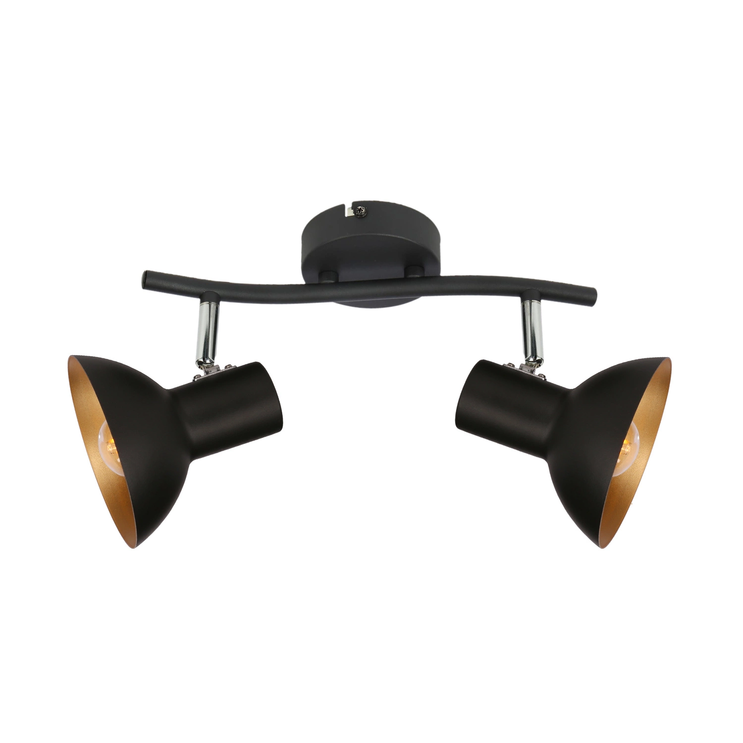 DISO 92-63427 to nowoczesna lampa sufitowa z dwoma źródłami światła. Wykonana została z wysokiej jakości metalu w kolorze czarno-złotym z chromowymi detalami. Lampa posiada dwa rozłożyste klosze osadzone na ruchomych przegubach, które dają możliwość regulacji kąta padania światła. Oprawa będzie idealnym wyborem do nowoczesnych wnętrz. Doskonale będzie się prezentować w: salonie, jadalni, sypialni, pokoju młodzieżowym, gabinecie, biurze, lokalu, przedpokoju, korytarzu. Wysokość lampy to: 20 cm, szerokość 38 cm, głębokość 12 cm. Źródłem światła jest żarówka typu E27 o mocy max 40W w ilości 2 szt.
