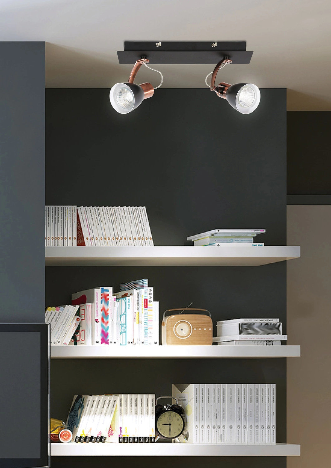 MARKUS 92-37442-M to nowoczesna lampa sufitowa z dwoma źródłami światła. Wykonana została z wysokiej jakości metalu w kolorze czarnym z miedzianymi detalami. Klosze lampy mają możliwość regulacji w pionie i poziomie. Oprawa będzie idealnym wyborem do nowoczesnych wnętrz. Doskonale będzie się prezentować w: salonie, jadalni, sypialni, pokoju młodzieżowym, gabinecie, biurze, lokalu, przedpokoju, korytarzu, kuchni. Wysokość lampy to: 17 cm, szerokość 30 cm, głębokość 8 cm. Źródłem światła jest żarówka typu GU10 o mocy max 50W w ilości 2 szt.