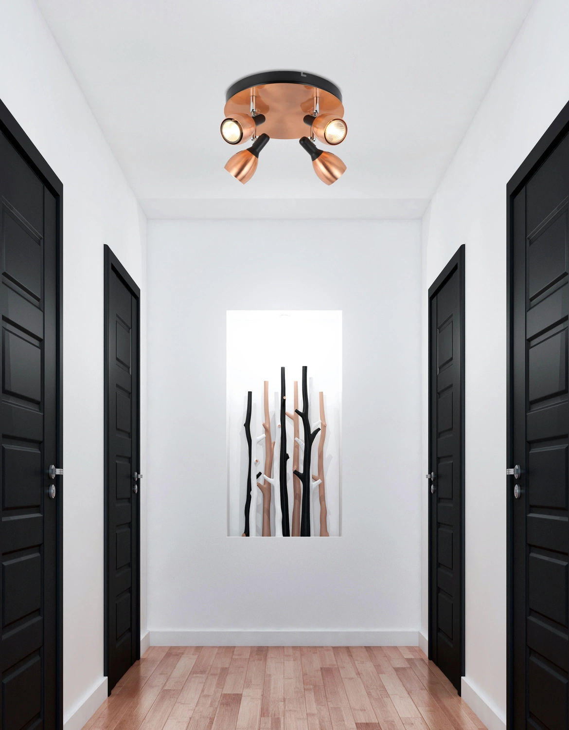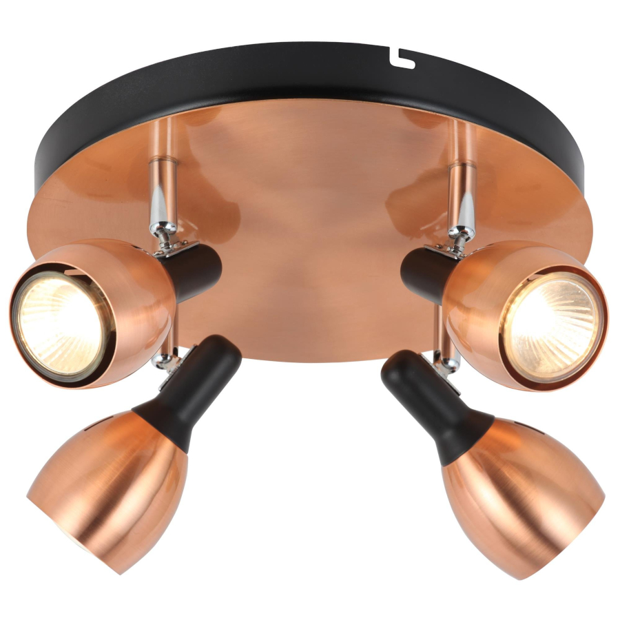 CROSS 98-34878 to nowoczesna lampa sufitowa z czterema źródłami światła. Wykonana została z wysokiej jakości metalu w kolorze miedzianym z czarnymi i chromowymi wstawkami. Lampa posiada cztery klosze osadzone na ruchomych przegubach, które dają możliwość regulacji kąta padania światła. Oprawa będzie idealnym wyborem do wnętrz urządzonych w stylu nowoczesnym, rustykalnym oraz vintage. Doskonale będzie się prezentować w: salonie, jadalni, sypialni, pokoju młodzieżowym, gabinecie, biurze, lokalu, przedpokoju, korytarzu. Wysokość lampy to: 16 cm, szerokość 35 cm, głębokość 35 cm. Źródłem światła jest żarówka typu GU10 o mocy max 50W w ilości 4 szt. (źródła światła w zestawie)