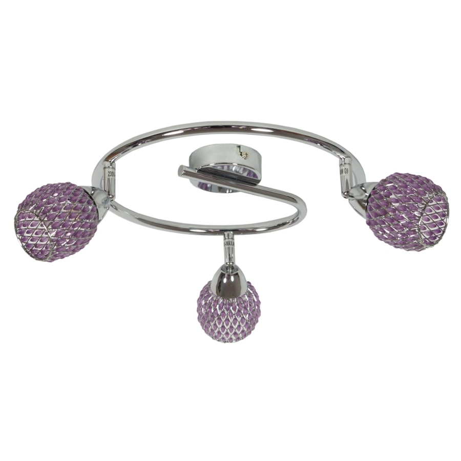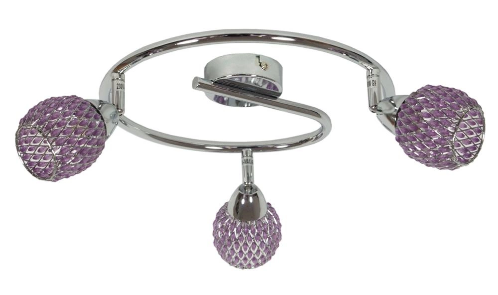 CLEAR 98-06936 to nowoczesna lampa sufitowa z trzema źródłami światła. Korpus lampy wykonano z chromowanego metalu. Lampa posiada trzy niezwykle eleganckie druciane klosze zdobione fioletowymi kryształkami. Klosze są osadzone na ruchomych przegubach, które dają możliwość regulacji w pionie i poziomie. Oprawa będzie idealnym wyborem do wnętrz urządzonych w nowoczesnym stylu. Doskonale będzie się prezentować w: salonie, jadalni, sypialni, pokoju młodzieżowym, gabinecie, biurze, lokalu, przedpokoju, korytarzu. Wysokość lampy to: 19 cm, szerokość 64 cm, głębokość 64 cm. Źródłem światła jest żarówka typu G9 o mocy max 40W w ilości 3 szt.