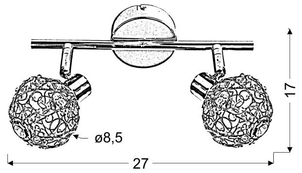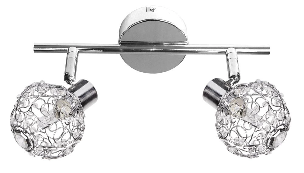COLLAR 92-13644 to nowoczesna lampa sufitowa z dwoma źródłami światła, która może służyć także jako kinkiet. Wykonana została z wysokiej jakości metalu w kolorze chromowym. Lampa posiada dwa kuliste druciane klosze zdobione koralikami z akrylu, zamknięte dużymi kryształami w chromowych ramkach. Klosze osadzone są na ruchomych przegubach, które dają możliwość regulacji kąta padania światła. Oprawa będzie idealnym wyborem do wnętrz urządzonych w nowoczesnym stylu. Doskonale będzie się prezentować w: salonie, jadalni, sypialni, pokoju młodzieżowym, gabinecie, biurze, lokalu, przedpokoju, korytarzu. Wysokość lampy to: 17 cm, szerokość 27 cm, głębokość 8,5 cm. Źródłem światła jest żarówka typu G9 o mocy max 40W w ilości 2 szt. (źródła światła w zestawie)