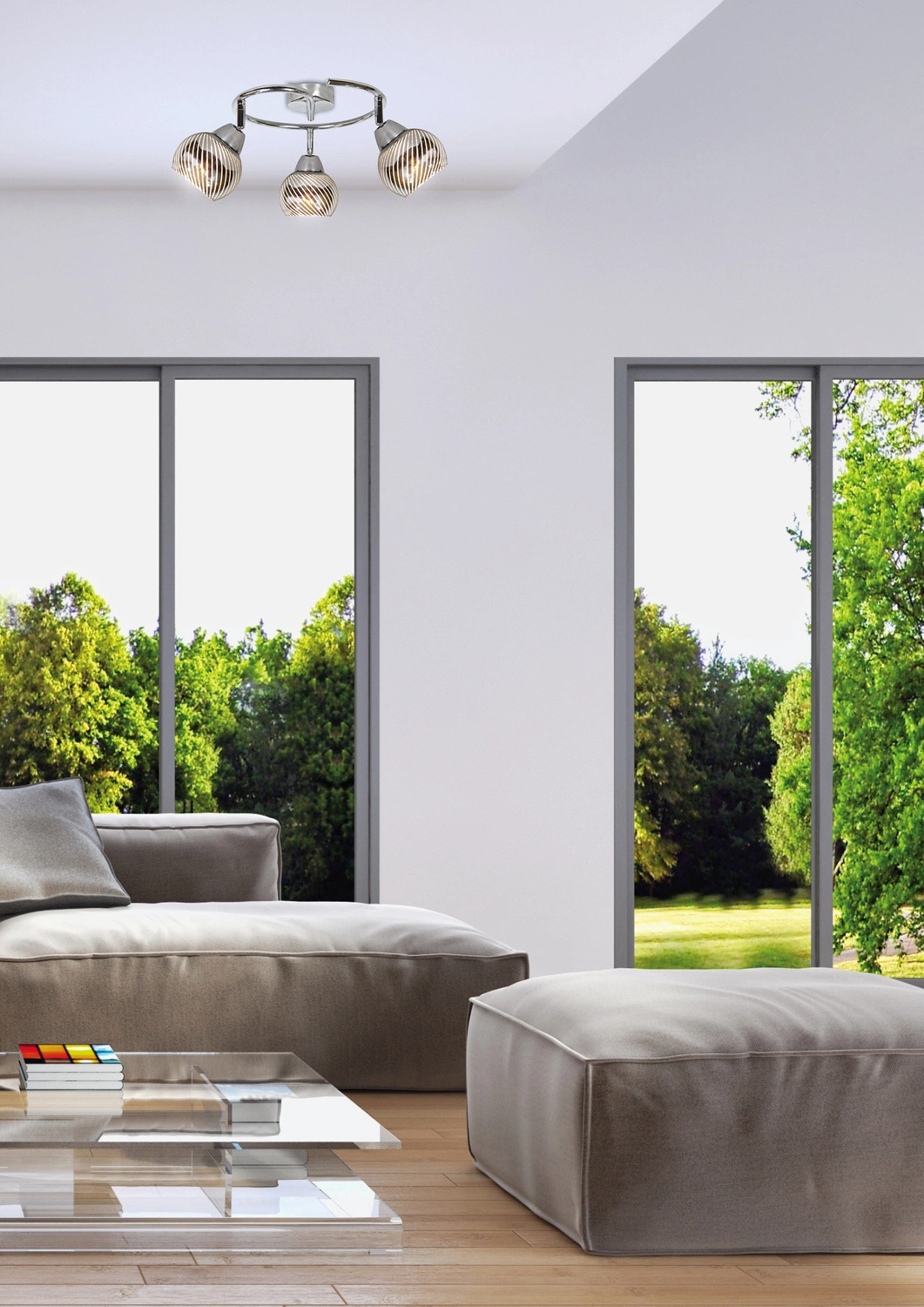 FORT 98-62833 to nowoczesna lampa sufitowa z trzema źródłami światła. Wykonana została z wysokiej jakości stali w kolorze chromowym. Lampa posiada trzy szklane lustrzane klosze dekorowane cienkimi poprzecznymi liniami. Klosze osadzone są na ruchomych przegubach, które dają możliwość regulacji ich położenia. Oprawa będzie idealnym wyborem do klasycznych oraz nowoczesnych wnętrz. Doskonale będzie się prezentować w: salonie, jadalni, sypialni, pokoju młodzieżowym, gabinecie, biurze, lokalu, przedpokoju, korytarzu. Wysokość lampy to: 19 cm, szerokość 38 cm, głębokość 38 cm. Źródłem światła jest żarówka E14 typu LED o mocy max 10W w ilości 3 szt.