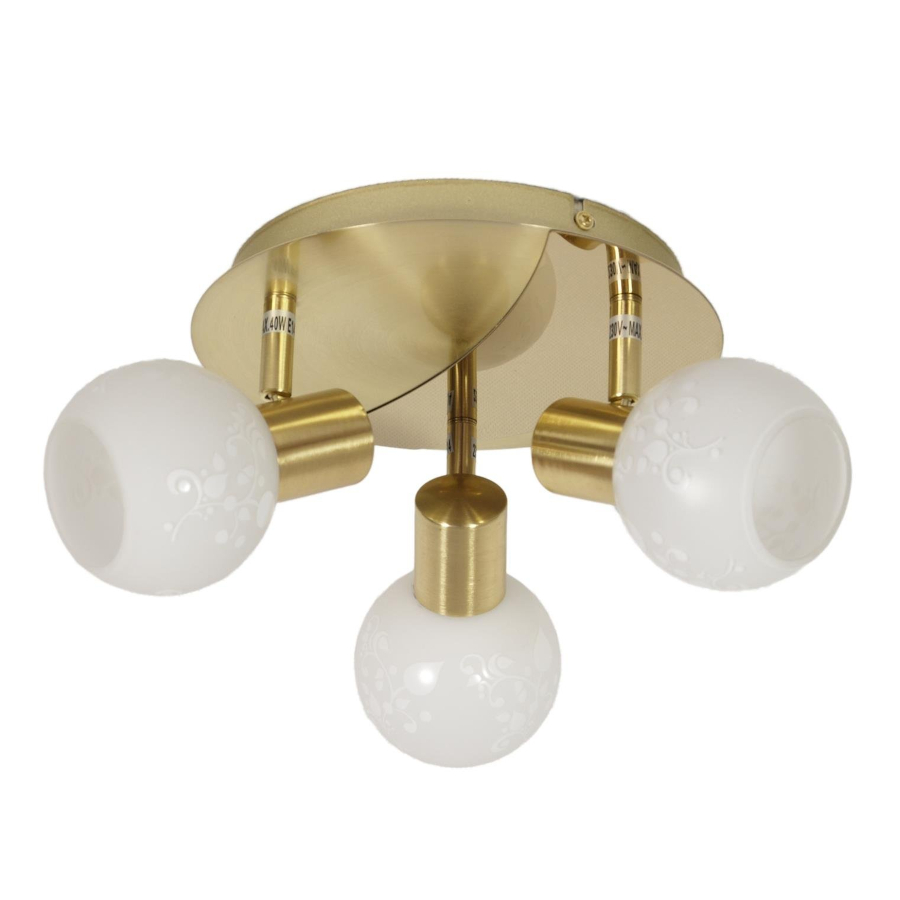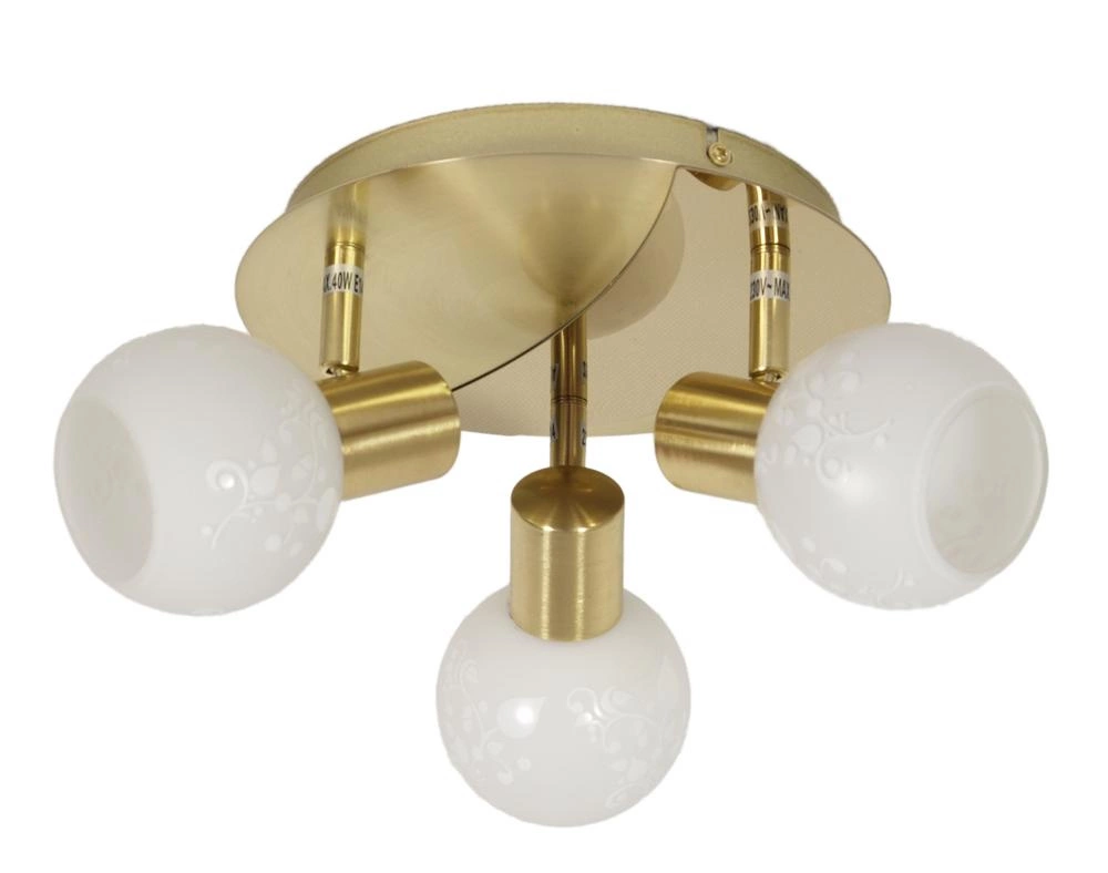 AVILA 98-07131 to nowoczesna lampa sufitowa z trzema źródłami światła. Wykonana została z wysokiej jakości stali w kolorze mosiężnym ze złotą wstawką. Lampa posiada trzy kuliste szklane klosze koloru białego z subtelnymi wzorami. Klosze mają możliwość regulacji kąta padania światła. Oprawa będzie idealnym wyborem do nowoczesnych wnętrz. Doskonale będzie się prezentować w: salonie, jadalni, sypialni, pokoju młodzieżowym, gabinecie, biurze, lokalu, przedpokoju, korytarzu. Wysokość lampy to: 16 cm, szerokość 36 cm, głębokość 36 cm. Źródłem światła jest żarówka typu E14 o mocy max 40W w ilości 3 szt.