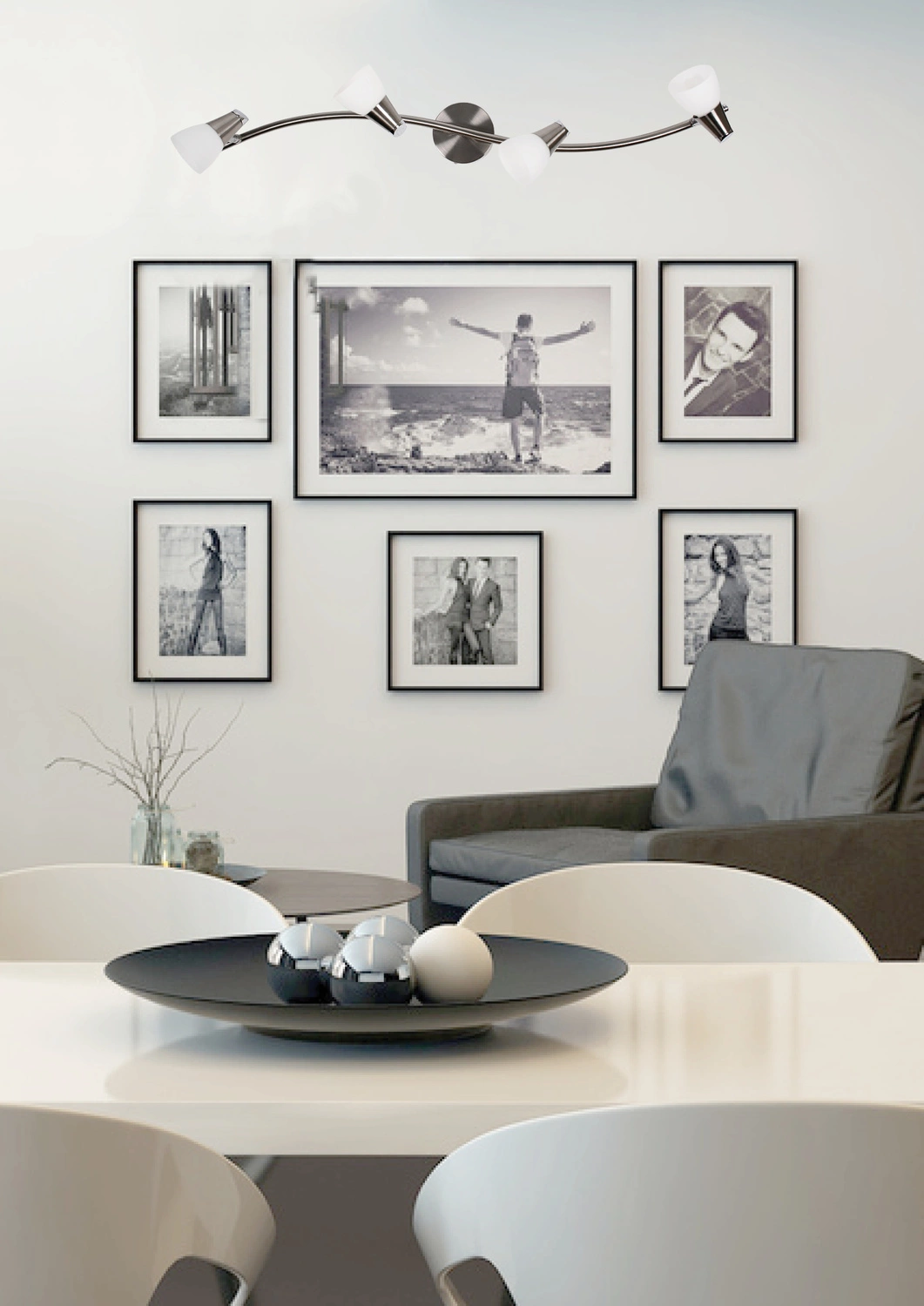 SELIA 94-70005 to nowoczesna lampa sufitowa z czterema źródłami światła, która może służyć także jako kinkiet. Wykonana została z wysokiej jakości metalu w kolorze niklowym z chromowymi wstawkami. Lampa posiada cztery szklane białe klosze osadzone na ruchomych przegubach, które dają możliwość regulacji kąta padania światła. Oprawa będzie idealnym wyborem do wnętrz urządzonych w klasycznym oraz nowoczesnym stylu. Doskonale będzie się prezentować w: salonie, jadalni, sypialni, pokoju młodzieżowym, gabinecie, biurze, lokalu, przedpokoju, korytarzu. Wysokość lampy to: 12 cm, szerokość 76 cm, głębokość 17 cm. Źródłem światła jest żarówka typu G9 o mocy max 40W w ilości 4 szt.