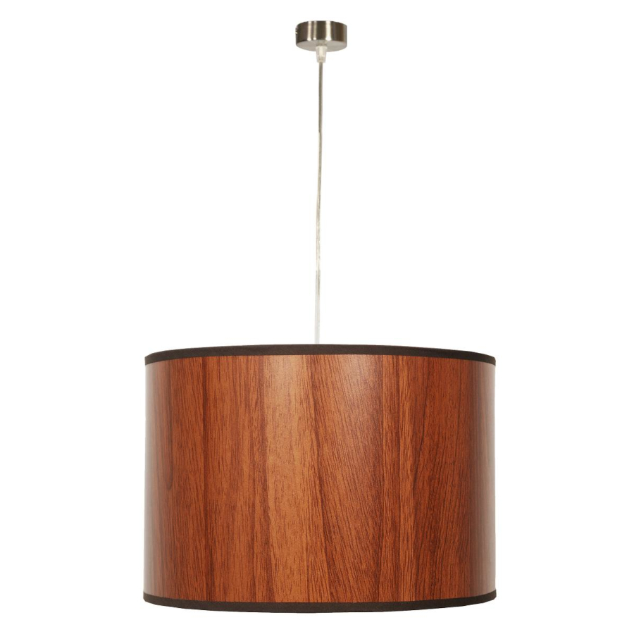 TIMBER 31-56743 to nowoczesna lampa wisząca z jednym źródłem światła. Podsufitkę lampy wykonano z wysokiej jakości stali w kolorze satynowym. Abażur ma kształt walca, jest wykonany z tworzywa PCV o fakturze drewna. Lampa będzie idealnym wyborem do wnętrz urządzonych w stylu nowoczesnym oraz skandynawskim. Doskonale będzie się prezentować w: salonie, sypialni, jadalni, pokoju młodzieżowym, gabinecie, lokalu, biurze, kuchni. Dużą zaletą jest możliwość regulacji wysokości. Wysokość maksymalna lampy to: 110 cm, szerokość 30 cm, głębokość 30 cm. Źródłem światła jest żarówka typu E27 o mocy max 60W w ilości 1 szt.