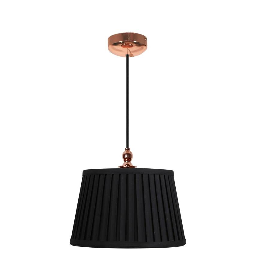 AMORE 31-39378 to stylowa lampa wisząca z jednym źródłem światła. Zawiesie lampy wykonano z wysokiej jakości metalu w kolorze miedzianym, abażur jest z czarnej plisowanej tkaniny. Oprawa będzie idealnym wyborem do wnętrz urządzonych w klasycznym stylu. Doskonale będzie się prezentować w: salonie, jadalni, sypialni, pokoju młodzieżowym, gabinecie, lokalu, biurze, kuchni. Dużym atutem jest możliwość regulacji wysokości. Wysokość maksymalna lampy to: 110 cm, średnica 30 cm. Źródłem światła jest żarówka typu E27 o mocy max 60W w ilości 1 szt.