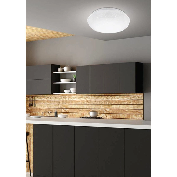 SKY 13-64547 to stylowa lampa sufitowa z jednym źródłem światła. Lampa posiada akrylowy biały klosz o niespotykanej przestrzennej budowie z widocznym po zaświeceniu efektem gwiezdnego nieba. Oprawa będzie idealnym wyborem do wnętrz urządzonych w stylu nowoczesnym oraz minimalistycznym. Doskonale będzie się prezentować w: salonie, jadalni, sypialni, pokoju młodzieżowym, gabinecie, lokalu, kuchni. Wysokość lampy to: 9 cm, średnica 34 cm. Źródłem światła jest wymienny LED o mocy 10W, neutralnej barwie 4000K i jasności 660lm