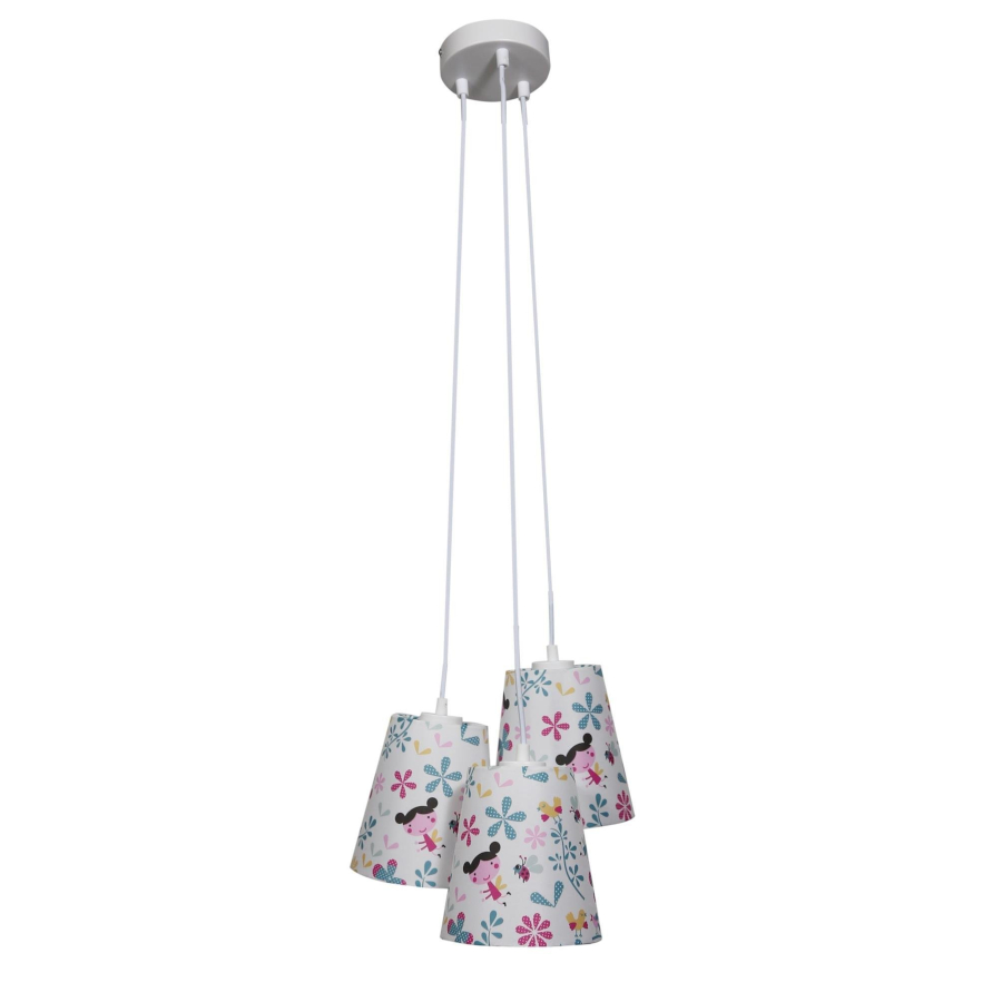 GIRL 33-62949 to nowoczesna lampa wisząca z trzema źródłami światła przeznaczona do dziecięcego pokoju. Podsufitkę wykonano z wysokiej jakości metalu w kolorze białym. Abażury są z kolorowej tkaniny wzmocnionej od wewnątrz PCV. Dużą zaletą lampy jest możliwość regulacji wysokości. Wysokość maksymalna to: 100 cm, szerokość 32 cm, głębokość 32 cm. Źródłem światła jest żarówka typu E27 o mocy max 40W w ilości 3 szt.