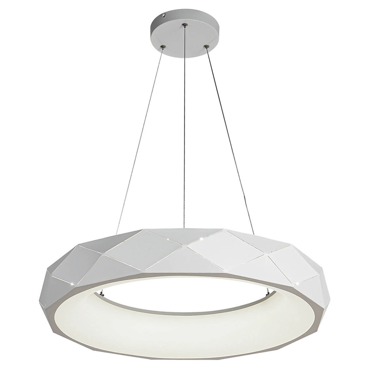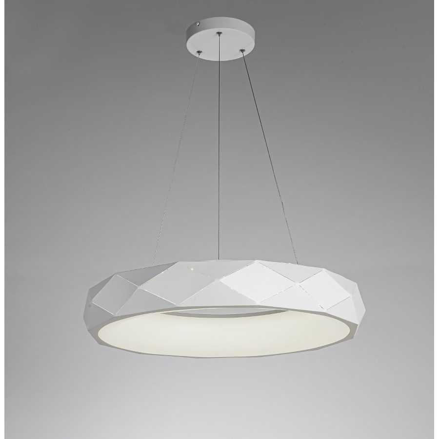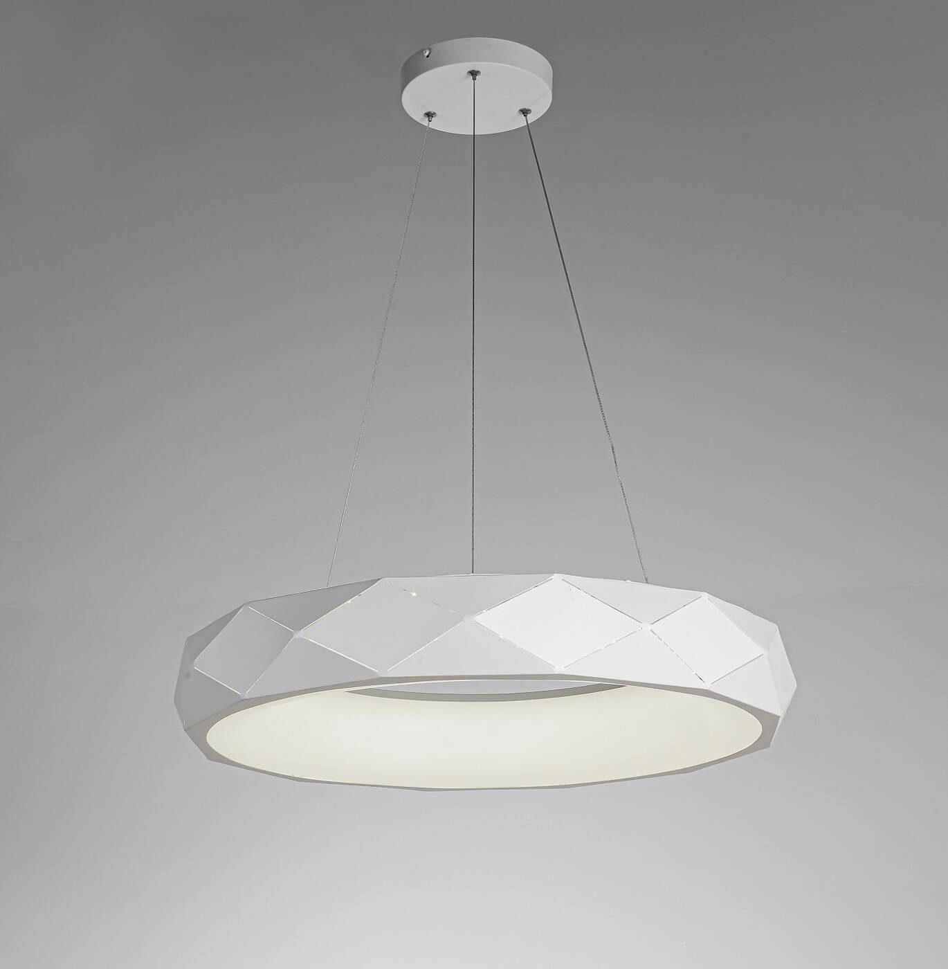 REUS LP-8069/1P LED WH to stylowa lampa wisząca z jednym źródłem światła. Wykonana została z wysokiej jakości metalu w kolorze białym. Model ten charakteryzuje się kloszem w kształcie pierścienia, który z zewnątrz zawiera geometryczne wzory a od wewnątrz ma mleczną osłonę z tworzywa. Oprawa będzie idealnym wyborem do wnętrz urządzonych w nowoczesnym stylu. Doskonale będzie się prezentować w: salonie, jadalni, sypialni, pokoju młodzieżowym, gabinecie, lokalu, kuchni. Dużym atutem jest możliwość regulacji wysokości. Wysokość maksymalna lampy to: 90 cm, szerokość 60 cm, głębokość 60 cm. Źródłem światła jest zintegrowany LED o mocy 36W, neutralnej barwie 4000K i jasności 4100lm