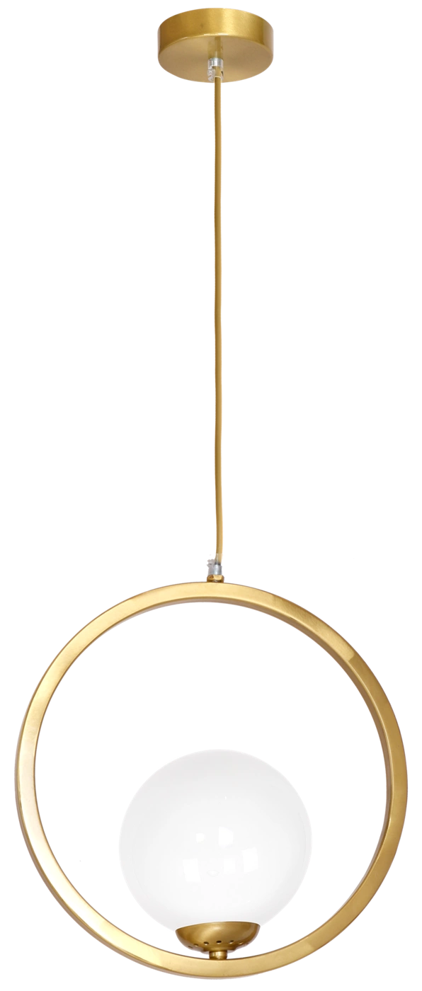 VIENNA MLP5573 to nowoczesna lampa wisząca z jednym źródłem światła. Wykonana jest z wysokiej jakości metalu w kolorze mosiądzu. Lampa wyglądem przypomina zwisający pierścień, wewnątrz którego zamocowano szklany klosz w kształcie kuli. Klosz ma kolor biały. Bardzo elegancki wygląd sprawia, że lampa będzie idealnym wyborem do nowoczesnych wnętrz. Doskonale wkomponuje się do: salonu, jadalni, sypialni, pokoju młodzieżowego, gabinetu. Dużym atutem jest możliwość regulacji wysokości. Wysokość maksymalna to: 100 cm, szerokość 30 cm, głębokość 14 cm. Klosz ma średnicę 14 cm. Źródłem światła jest żarówka typu E14 o mocy max 40W w ilości 1 szt.