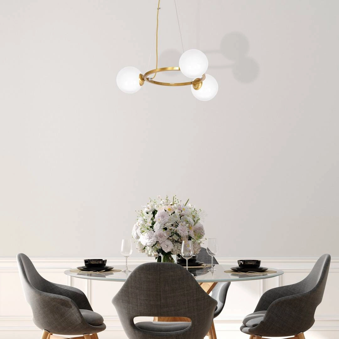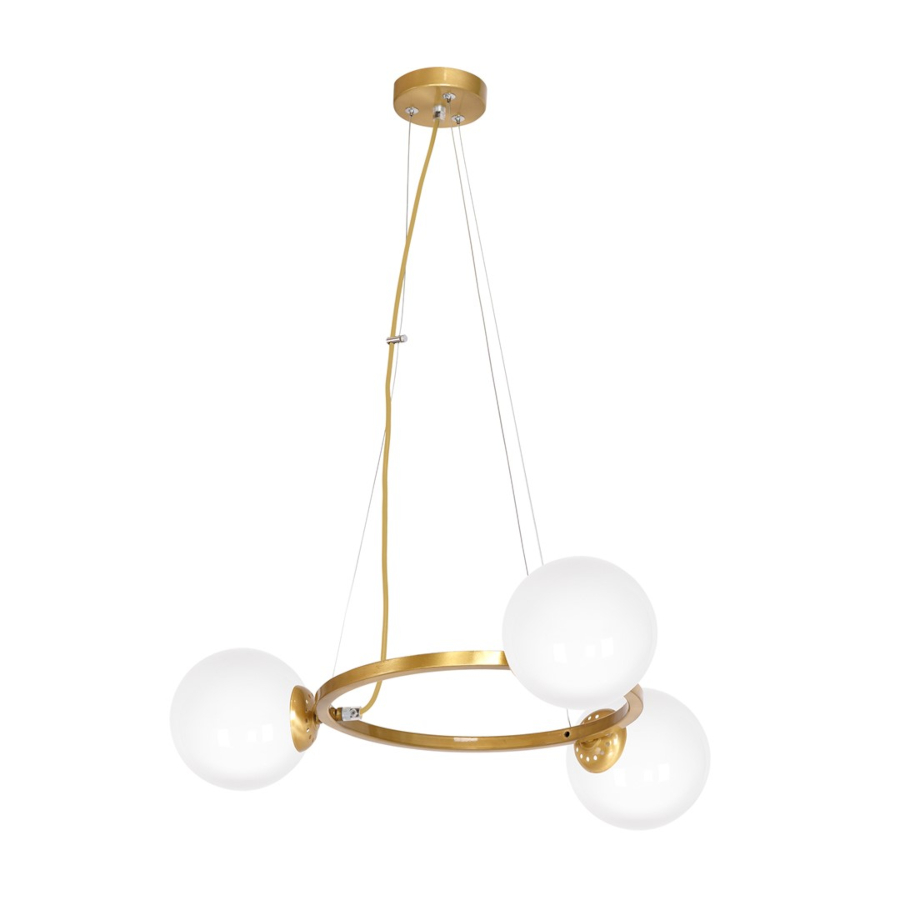 VIENNA MLP5576 to nowoczesna lampa wisząca z trzema źródłami światła. Wykonana jest z wysokiej jakości metalu w kolorze mosiądzu. Lampa posiada zwisający poziomo pierścień, na którym osadzono trzy szklane klosze w kształcie kuli. Klosze mają kolor biały. Bardzo elegancki wygląd sprawia, że lampa będzie idealnym wyborem do nowoczesnych wnętrz. Doskonale wkomponuje się do: salonu, jadalni, sypialni, pokoju młodzieżowego, gabinetu. Dużym atutem jest możliwość regulacji wysokości. Wysokość maksymalna to: 100 cm, szerokość 55cm, głębokość 55 cm. Klosz ma średnicę 14 cm. Źródłem światła jest żarówka typu E14 o mocy max 40W w ilości 3 szt.