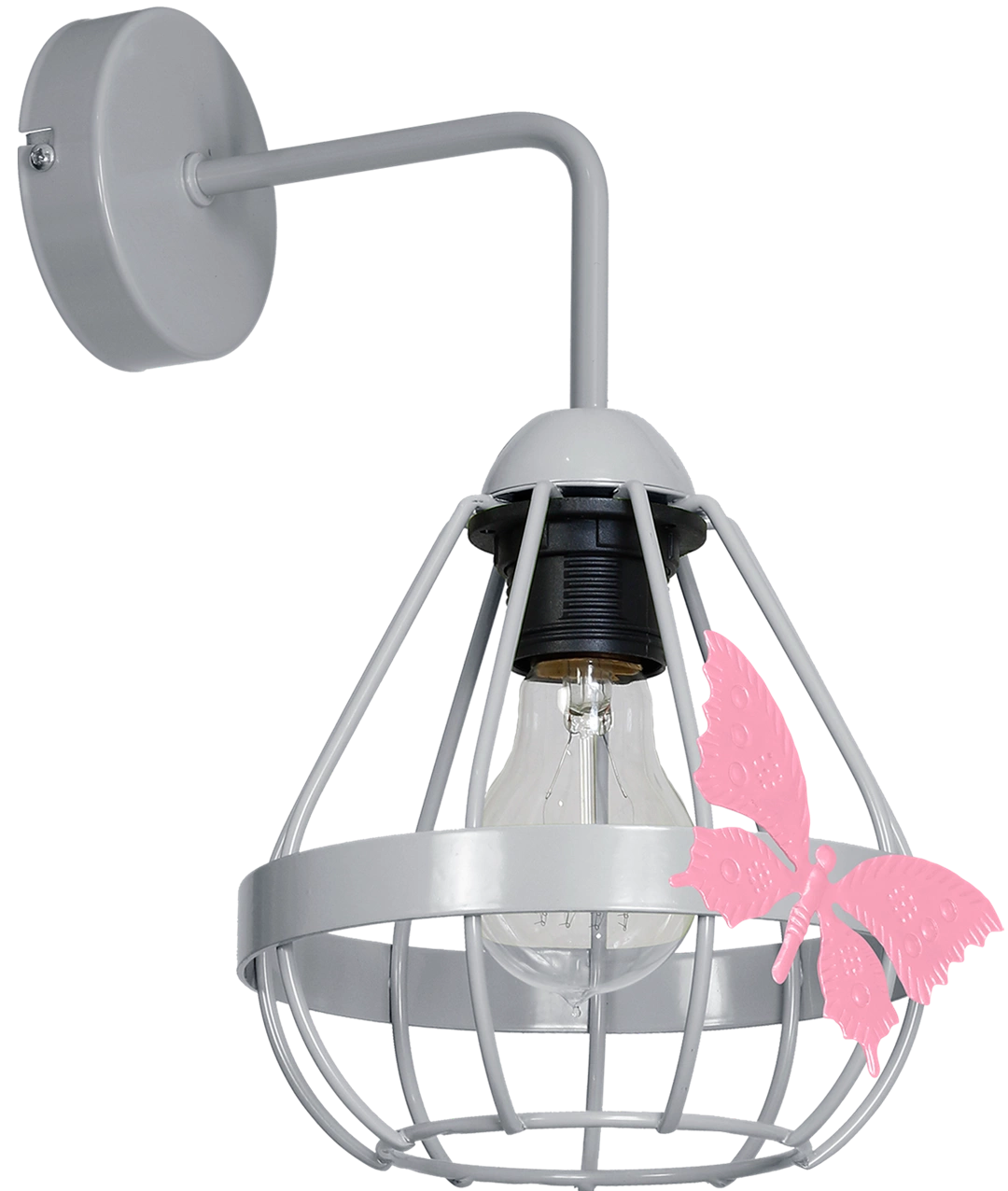 KAGO MLP4931 to nowoczesna lampa ścienna z jednym źródłem światła, która idealnie wkomponuje się do dziecięcego pokoju. Wykonana została z wysokiej jakości metalu w kolorze szarym z różowym detalem. Lampa posiada klosz z drutu o modnym kształcie eksponującym żarówkę. Dodatkowo klosz ozdobiony jest uroczym motylkiem. Kinkiet może stanowić uzupełnienie lamp wiszących tej serii jak i być oddzielnym elementem wystroju wnętrza. Wysokość kinkietu to: 27 cm, szerokość 17 cm, głębokość 27 cm. Źródłem światła jest żarówka typu E27 o mocy max 60W w ilości 1 szt.